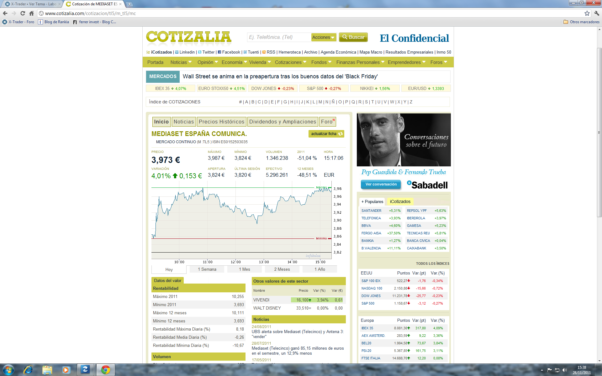Bueno, veamos, hoy... que yo vea, todavia no han llegado a ninguno de los topes que yo he puesto bien para la estrategia del santander o bien para la estrategia del tl5. Asi que... hoyyy, no me han saltado ninguna de las alarmas que tengo puestas... ni ha llegado a 5,77 en el san, ni ha llegado a 4 en tl5, asi que... todo esta como estaba, es decir, normal.
