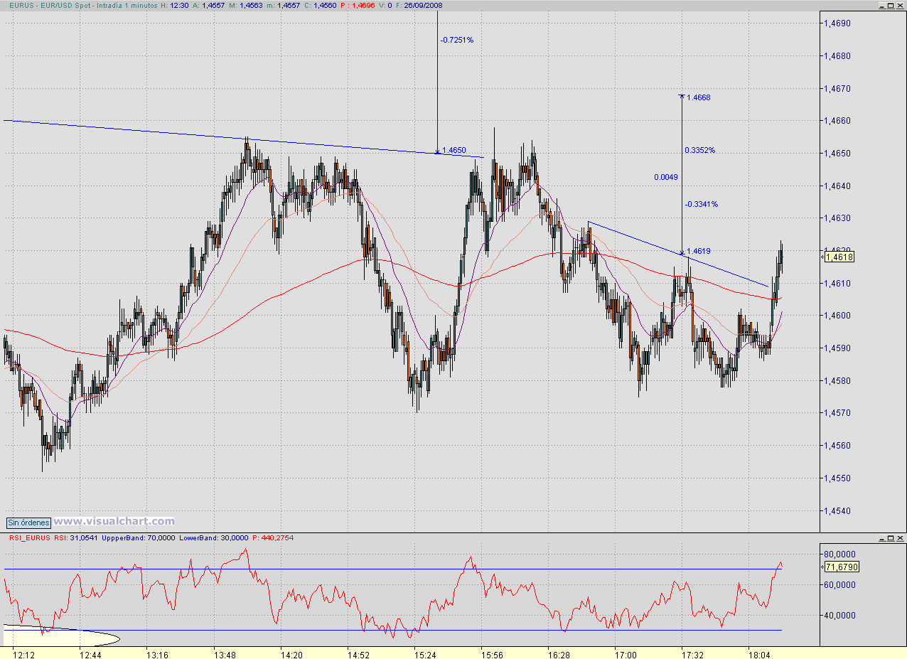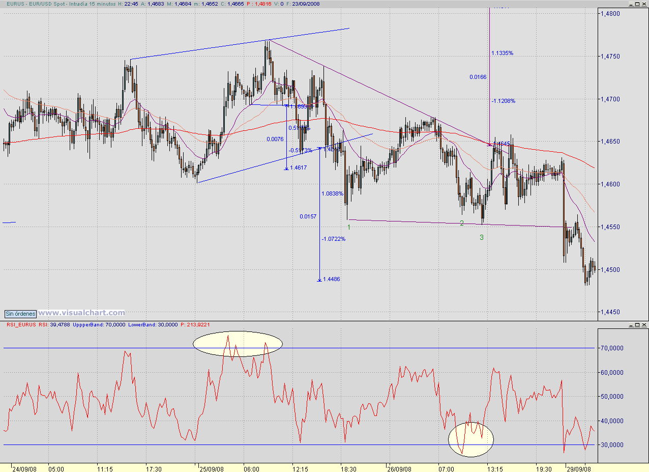 Holas. He estao en er pueblo. La verdad es que el otro día la cagué con el análisis de una forma mu tonta y me costó 50 pips de stop. La divergencia alcista que aparecía en el RSI 15" era más bien dudosilla porque el mínimo del primer pico (punto 2) no era absoluto u sea el mínimo anterior (punto 1) era más hondo y al final, claro, salió rana.