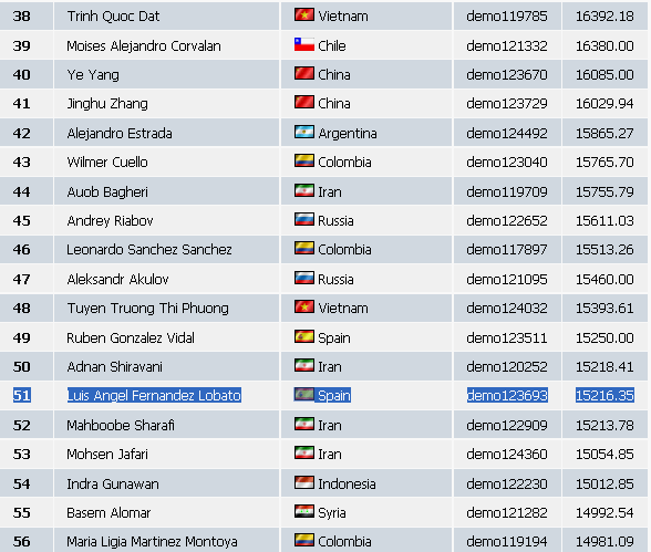 El primer español clasificado es Francisco Jose Romero Matas que se encuentra en el puesto 57 con una equity de 13.410,00$
