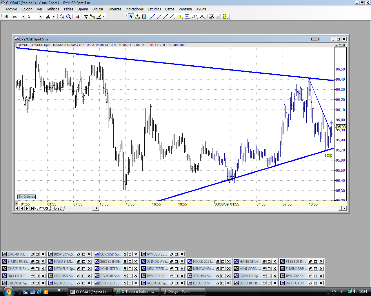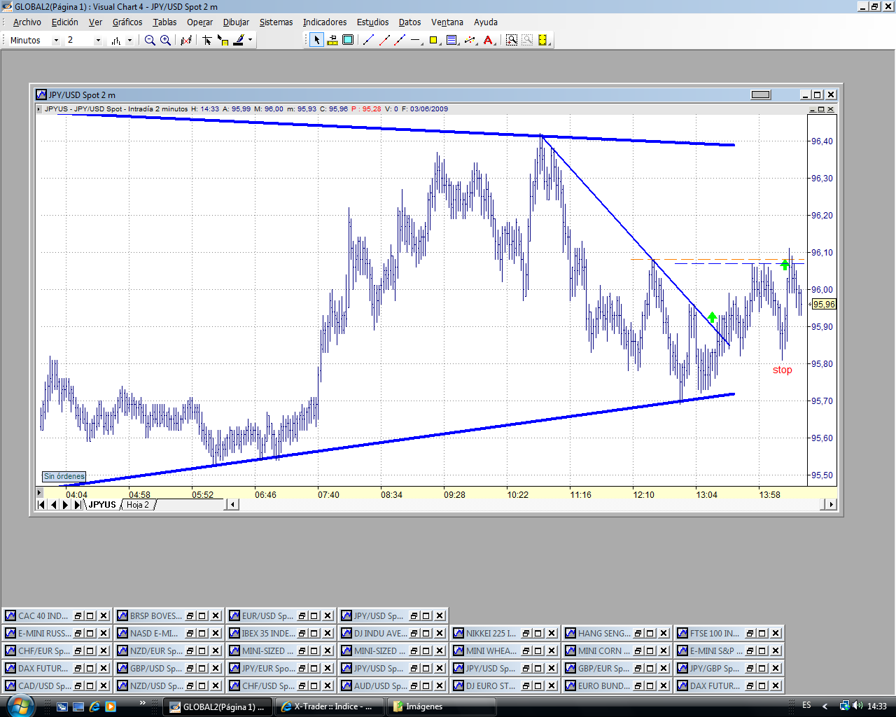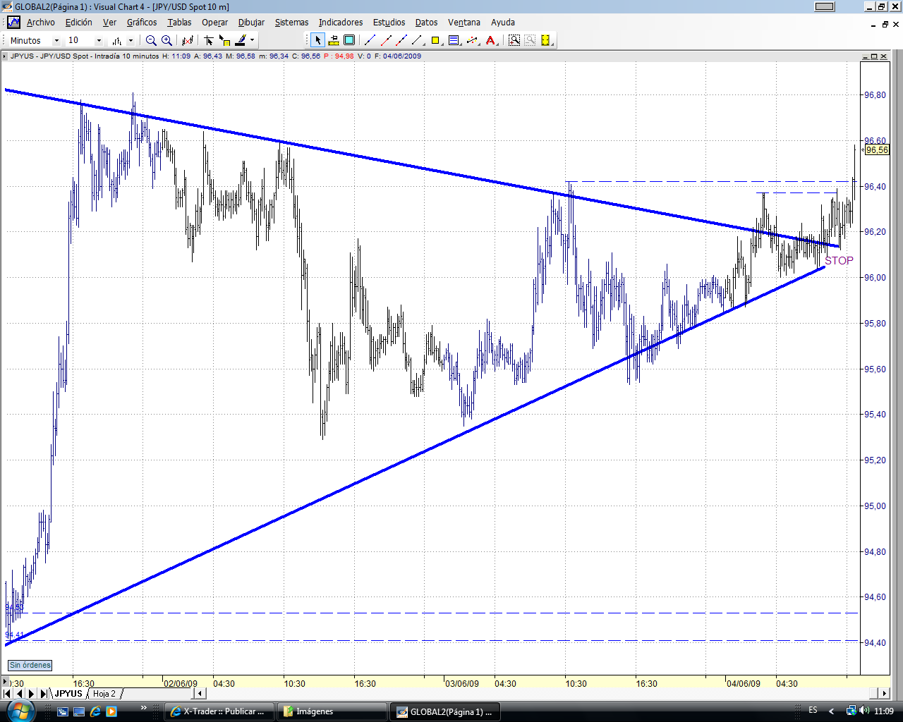 La superación del 96.10 debería llevar al precio a la parte alta del triángulo. Y yo creo que debería romper. En fin, el precio manda. Veremos lo que hace. Subimos stop a precio de entrada, 95.80.