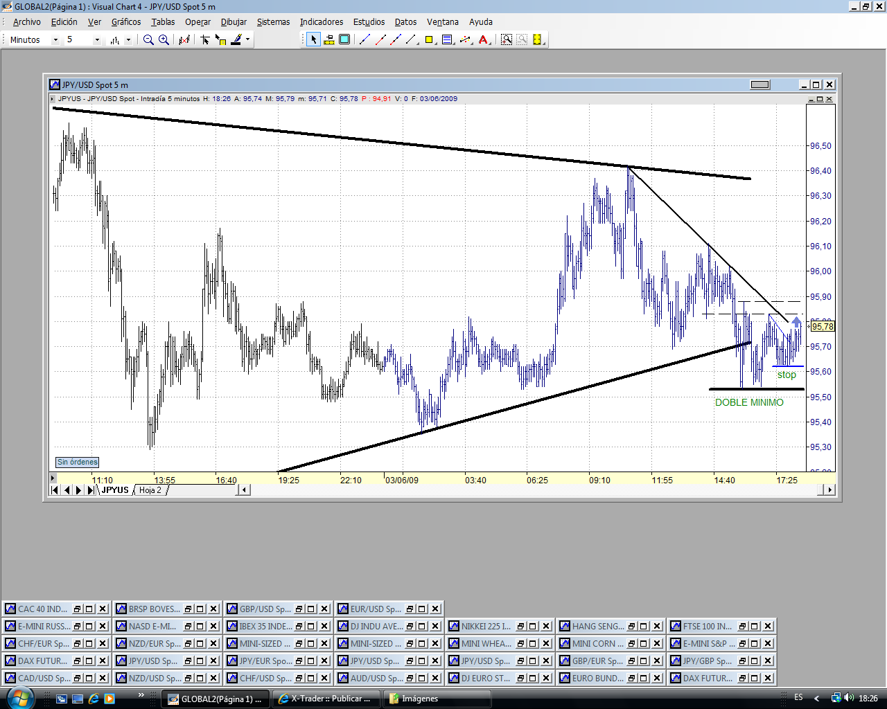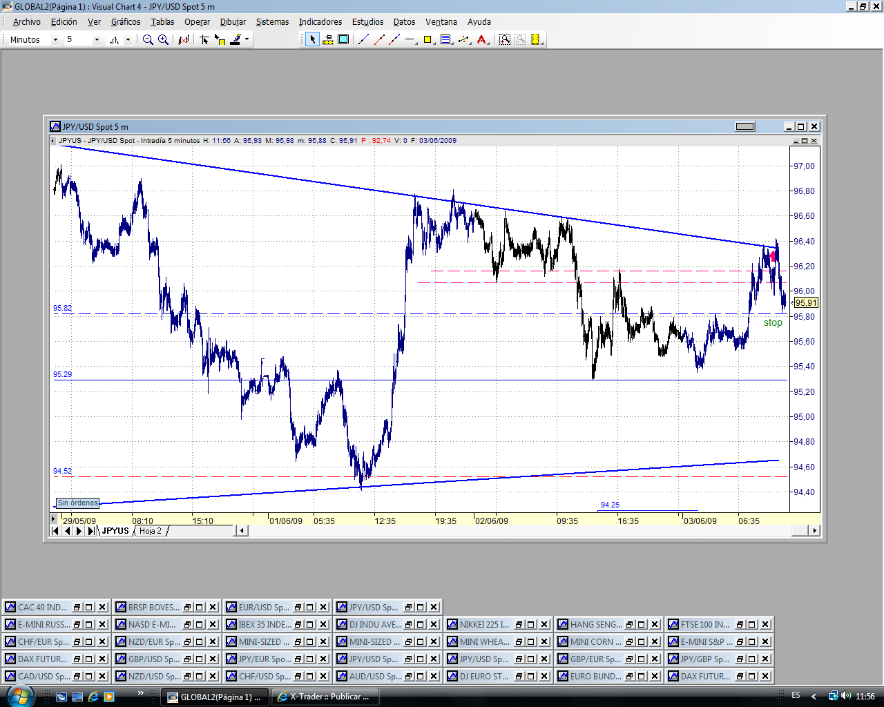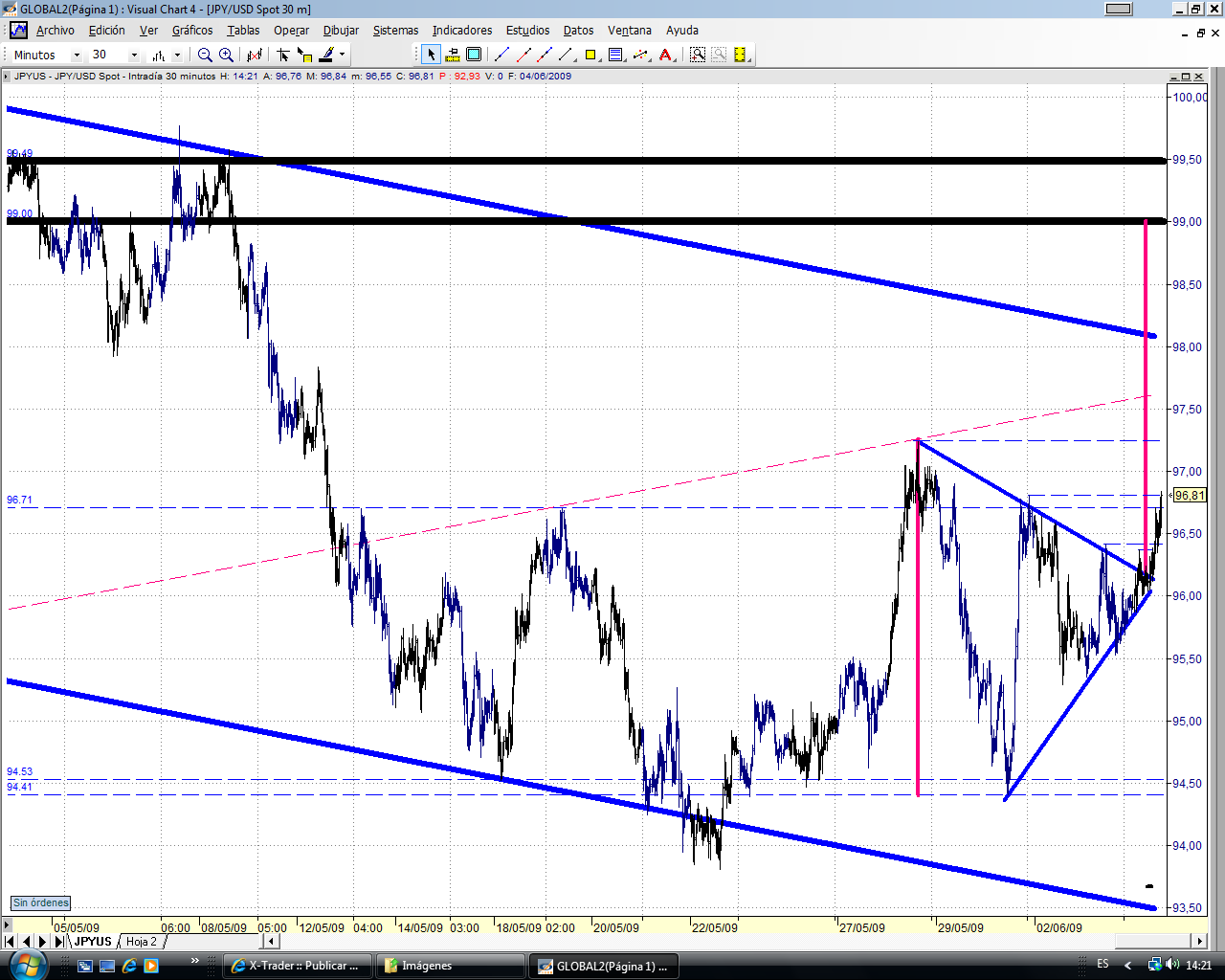 La superación del 96.10 debería llevar al precio a la parte alta del triángulo. Y yo creo que debería romper. En fin, el precio manda. Veremos lo que hace. Subimos stop a precio de entrada, 95.80.