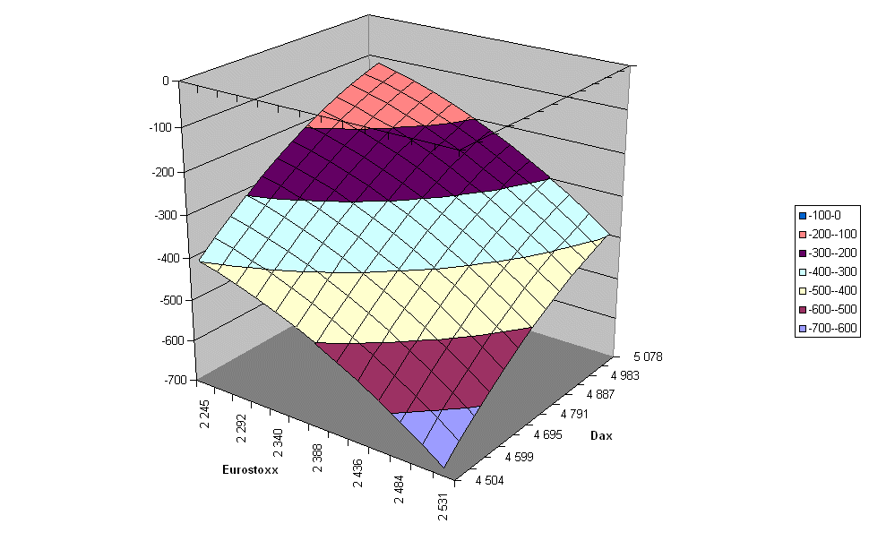 Algo así. Es un grafico de una put vendida ATM para el Dax y dos calls ATM compradas para el EuroStoxx.