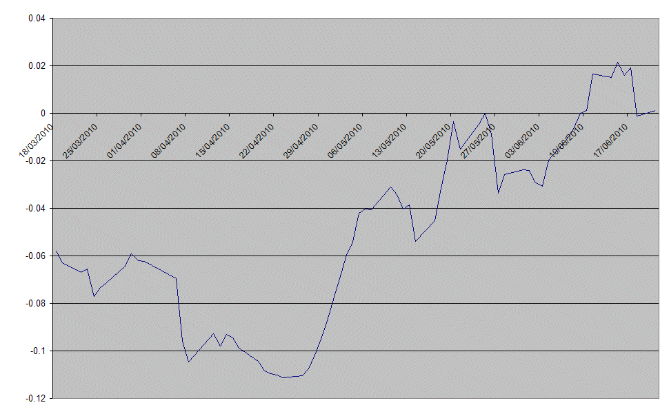 He ahi nuestro problema... buscar dos valores cointegrados perfectamente, bueno, eso es lo dificil, pero lo primero que se me ocurrio fue que una media de cualquier valor siempre esta cointegrada con dicho valor, pero... siempre hay un pero, nosotros no podemos tradear con el valor de la media (si asi fuera seria un arbitraje perfecto), en cada punto de trade que cogeriamos siempre ganariamos la distancia que hay de la media al valor, guauuu ... siempre siempre y sin excepciones...