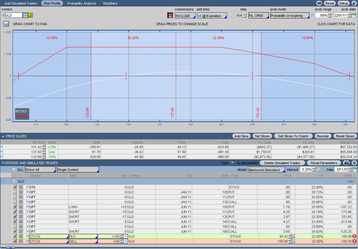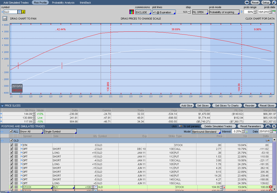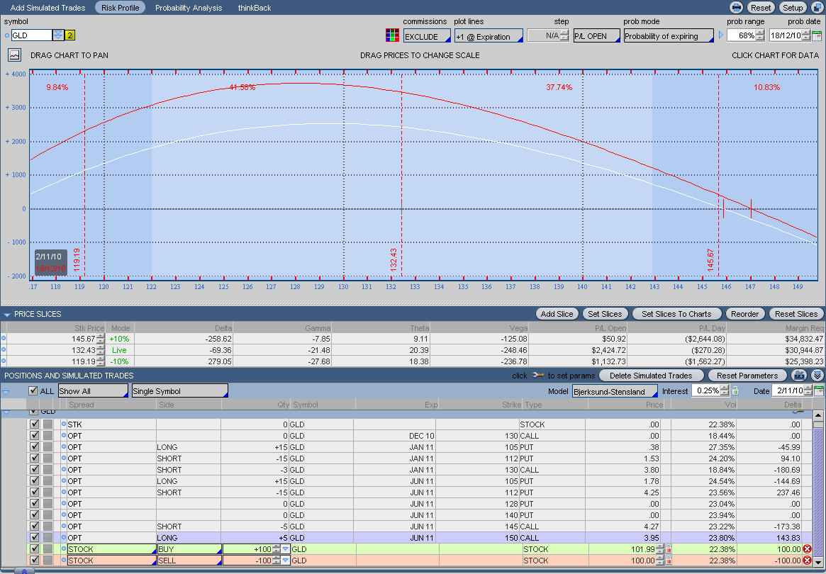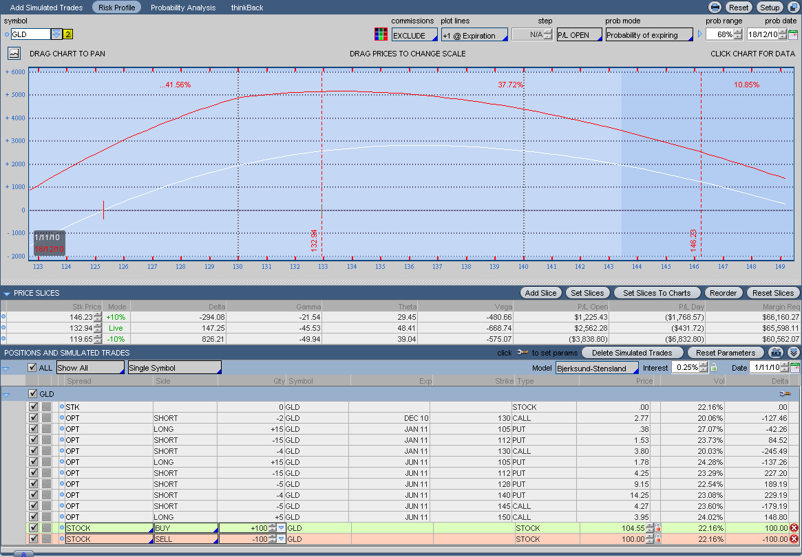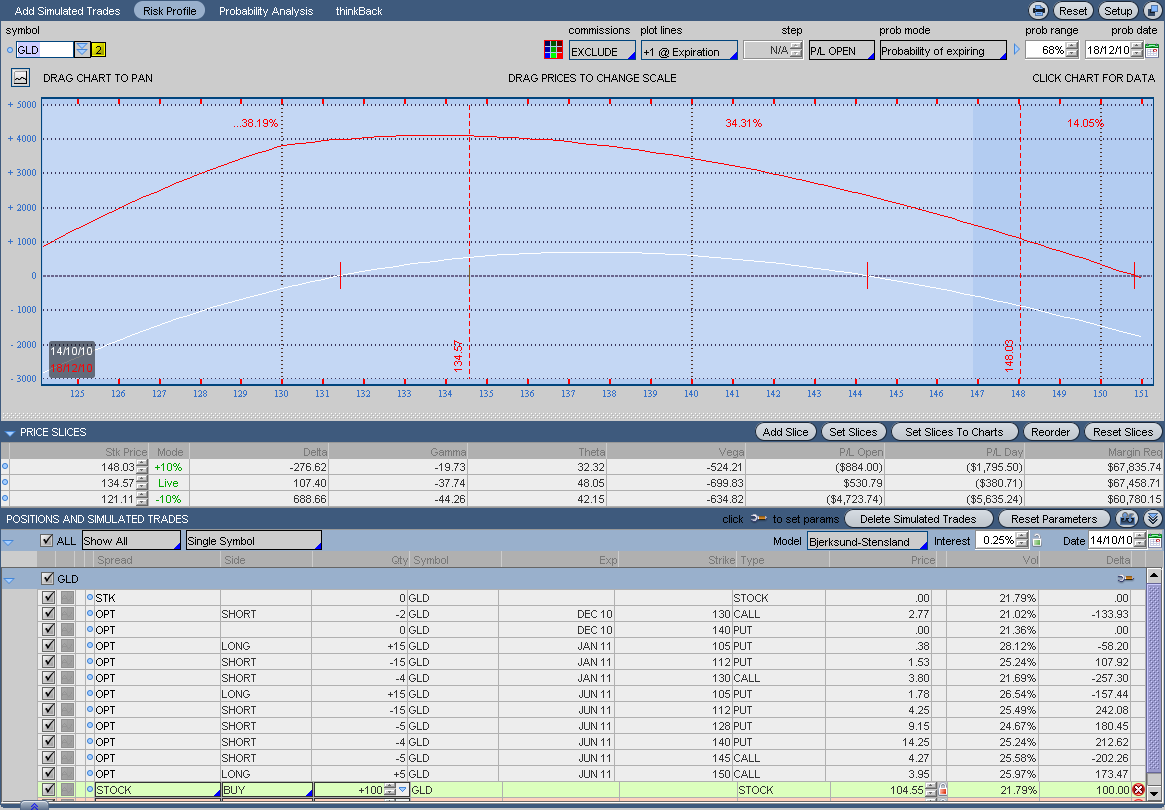 Si el oro empezara a bajar, lo defendería vendiendo Calls ITM de strike 120-125, no me gusta recomprar Opciones ATM. De todas formas es muy posible que este miercoles pegue un buen bajón, pero a largo creo que será alcista