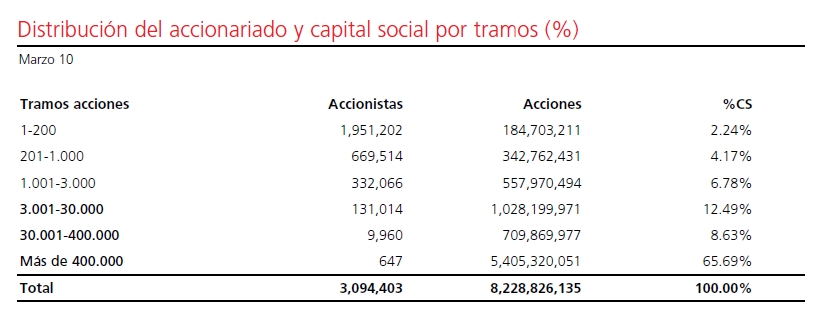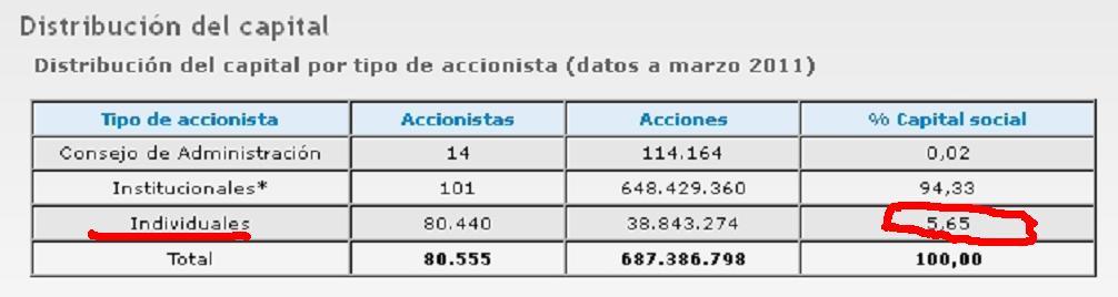 3º Que nos queda=...pués nos queda lo que casi nadie suele comentar cuando esgrime que el banco reparte riqueza a los pequeños ahorradores a través de sus dividendos ...y es que al menos que yo recuerde, allá por el 2010..las acciones en poder de gente como mi padre, o similares pequeños accionistas es de menos del 7%