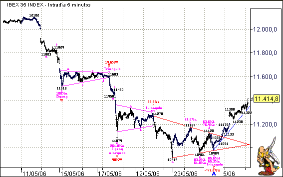 En el corto plazo, posteriormente a la rotura triangular al alza el jueves 25-5-2006, el empuje al alza parece alcanzar su objetivo. Por una parte, porque el máximo producido empieza a alcanzar el vértice de la formación triangular, y además, porque se suele decir que cuando se produce una rotura al alxa de una formación triangular, el alcance posterior alcanza un valor porcentual comprendido entre el 75 y 125 % de la onda de mayor tamaño. En este caso la onda del triángulo mayor es la onda "a" (en fucsia), y si se calcular el empuje posterior porcentualmente llevamos desarrollado aproximadamente el 122 %.