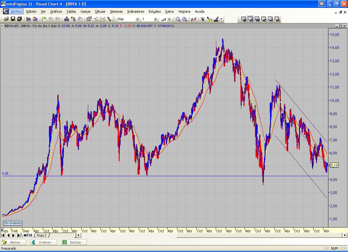 Santander sigue subiendo pero se acentúan las divergencias bajistas, y el macd esta apunto de cortar a la baja así como la formación de velas, otra vez más, no es esperanzadora, pero no hay que olvidarse que lo que manda es el precio y si quiere seguir subiendo pues que siga; subimos el stop a 4.65, nuevo soporte, el objetivo sigue siendo el mismo.