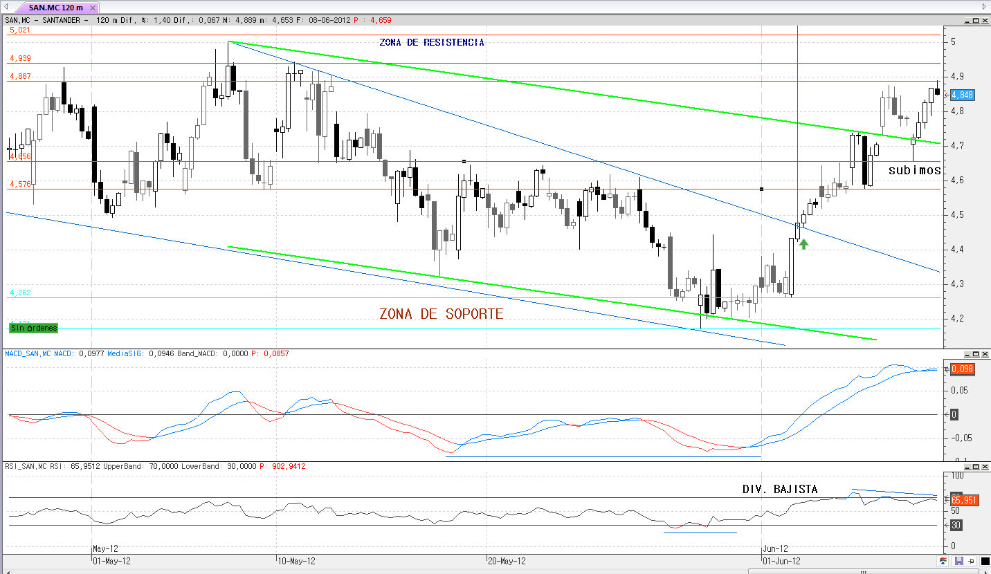 marvelas escribió:Santander sigue subiendo pero se acentúan las divergencias bajistas, y el macd esta apunto de cortar a la baja así como la formación de velas, otra vez más, no es esperanzadora, pero no hay que olvidarse que lo que manda es el precio y si quiere seguir subiendo pues que siga; subimos el stop a 4.65, nuevo soporte, el objetivo sigue siendo el mismo.