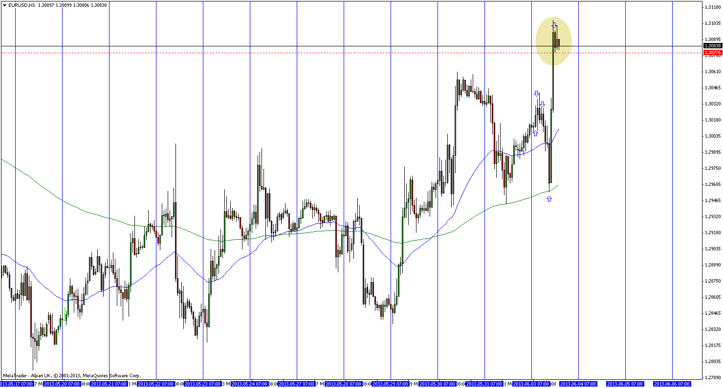 - Como veis, hay una vela larga (la primera de las dos) que tiene más de 70 pips y que sube desde mínimos hasta rebasar la apertura, convirtiéndose a su vez en vela de máximos. ¿Dónde colocaríamos la orden de bajada que se ha comido? Bien, ante este pequeño dilema (recordemos que la vela finaliza un poco por encima de la apertura), la orden desde máximos se colocaría en el nivel de la apertura, me parece algo bastante sensato dado el tamaño del bicho y que nuestro S/L es de 10 pips.
