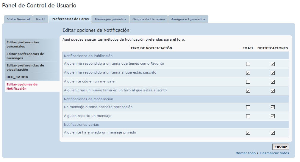 Gracias Ayuso, por lo que me has comentado veo que una de las novedades de esta versión es que es posible configurar en detalle todo el sistema de notificaciones, incluyendo que te mande un email para ciertos eventos, la verdad es que está bastante bien. Para configurarlo basta con ir a nuestro perfil de usuario y entrar a la pestaña Preferencias de Foros -> Editar Opciones de Notificación, tal y como podéis ver en el pantallazo adjunto:Ayuso Trading escribió:Las notificaciones de citas son una maravilla!!