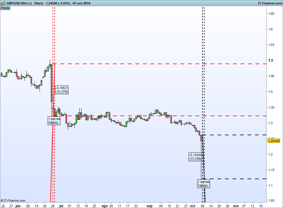A mí me pilló en directo, delante del ordenador. Empezé a ver un movimiento raro en el GBPUSD. Rápidamente mire el GBPJPY y veía lo mismo. Entonces me fijé en los otros pares majors, USDJPY,USDCHF y EURUSD para determinar si era un movimiento de pánico general en forex o era una anormalidad sólo en los cruces GBP. Cuando llegué a la conclusión de que sólo era un movimiento violento en cruces con GBP, entonces decidí cerrar dichos cruces que tenía en mi cartera y todo lo demás, por precaución.