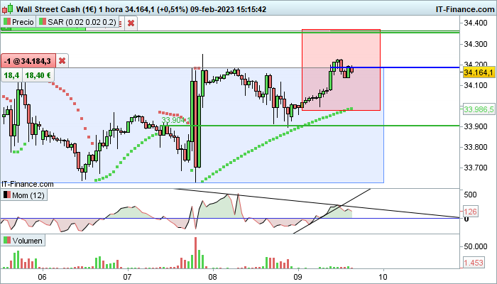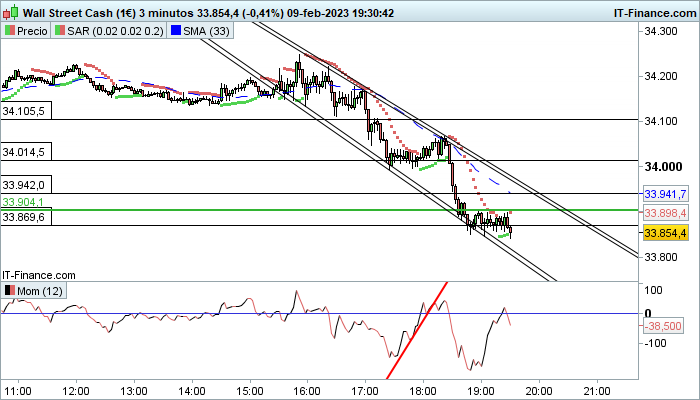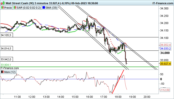 En grafico de 3m. esta haciendo un pequeño suelo en 34000 pero el indicador de fuerza momentum no acompaña...parece que no tiene fuerza pa subir...
