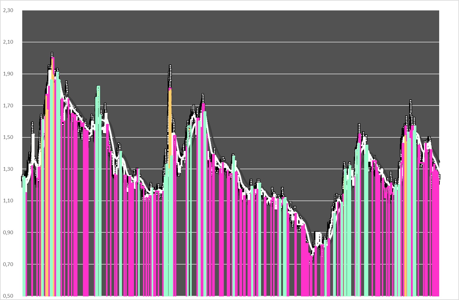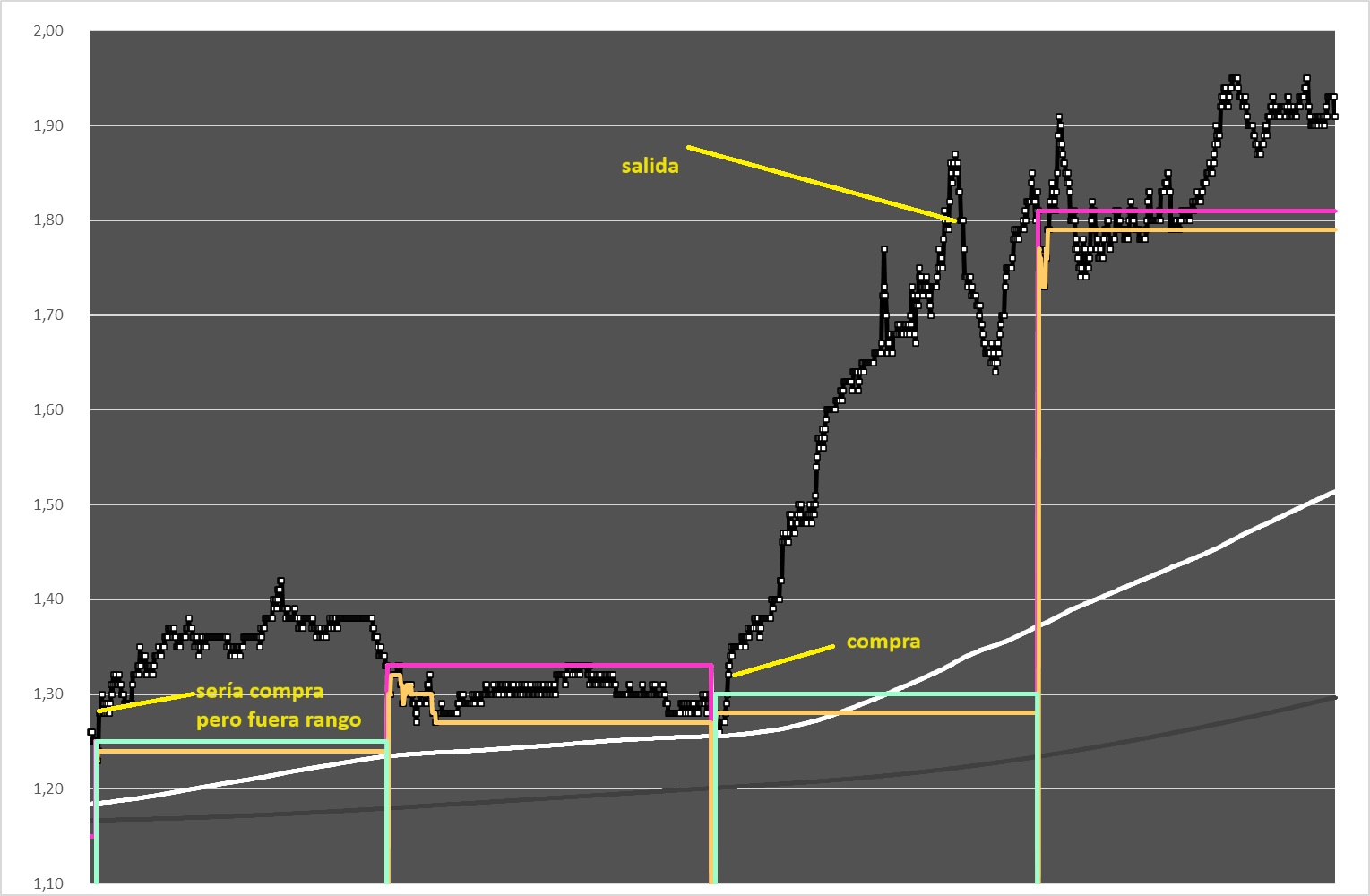 Ahora he puesto en el gráfico el algoritmo de señal, y dá entrada en las líneas rosas 1 y 3, la primera no entras porque el desplazamiento de precio es muy alto para el stop ceñido, pero hubiera sido un buen trade, de 1.26-1.42 cómo máximo recorrido (+12%), y el 3 dá señal con alto volumen y un precio en relación al riesgo muy positivo.