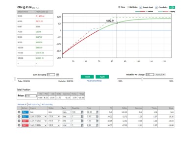 El gráfico de precio y el de riesgo a cierre de ayer El beneficio al cierre de ayer se ha reducido sensiblemente respecto al cierre del viernes anterior. Dado que el movimiento del precio no afecta por encima de 80, esa reducción se debe a la vega negativa que se ha comido por incremento de volatilidad más que lo ganado por theta. Todavía estamos a 3 meses de expiración por lo que seguro cambiará la evolución de la aplicación.