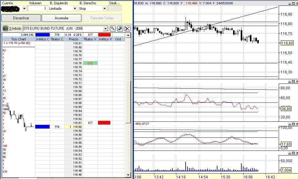 Creo que el 117.07 es un punto de visita casi obligada, pero repito es solo una apreciacion. Yo actuaria de la siguiente forma, si se pierde la tendencia del movimiento, que por cierto lleva una inclinacion demasiado exagerada, para considerar perdida de tendencia yo al menos diria que hay que ver en pantalla un 116.40, venderia en ese momento un par de calls 118, con idea de poner posicion corta de futuro si tocamos el pull back de tendencia.
