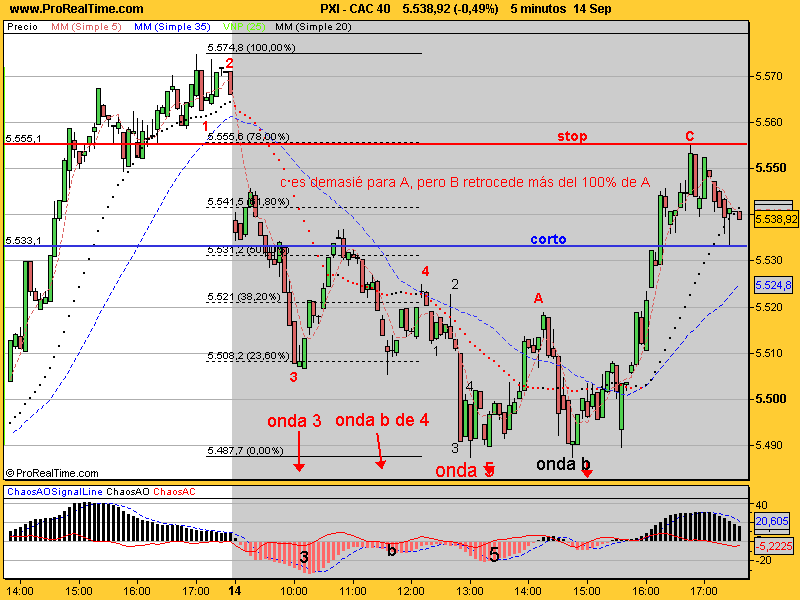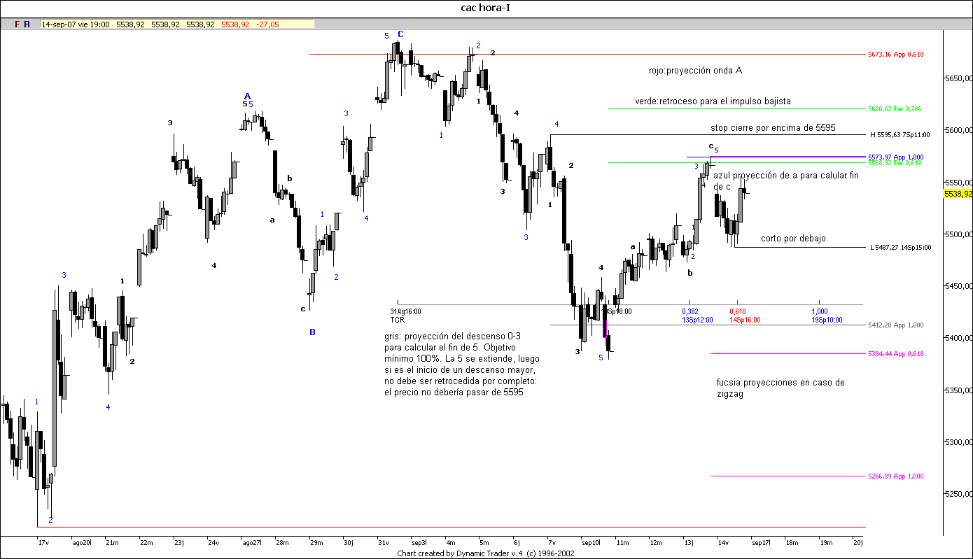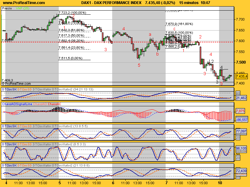 Pues podría ser una serie 1-2,1-2; pero la igualdad milimétrica entre los 2 movimientos (tb pasa esto en el mercao americano) me hacen pensar en un abc, o sea que la cosa se complica. El lunes rebotará. Si se está corto, habrá que ajustar los stops. Yo cerré a última hora el sp que me dio mal rollo. No creo que esté bajando ahora de forma impulsiva. Puede que esté en la onda 2 todavía. Por ahora, mientras no rompa el mínimo del viernes, no me pongo corto. El oscilador 8-5 en el diario apunta hacia abajo, pero está en sobreventa, el de 34 en 60m y observad el de 15. Para arriba vamos, lo malo es que no tengo ni idea de hasta dónde con la información de ahora. Ya veremos, pero dejar abiertos largos por la noche, como que da mal rollo.