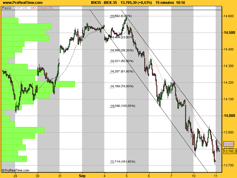 el ibex según diría Neely está cayendo de forma correctiva:demasiados puntos de contacto. Sigue dentro del canal. Esto de todas formas lo hace fácil de controlar: mientras siga en el canal pues es bajista, no conviene girarse hasta que no salga de él. Hay que tener en cuenta que muchas de estas correcciones tan bien canalizadas acaban formando un triángulo que rompe el canal.