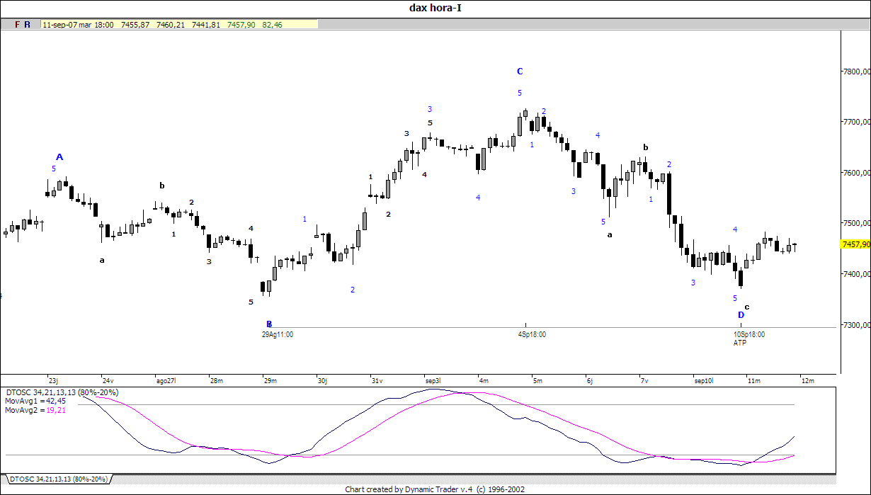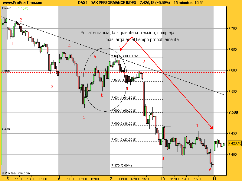 Pues he metío las proyecciones temporales en el gráfico de 5 min del dax y el 260 % de la última subida me sale a las 15 horas de hoy. Si sigue corrigiendo más tiempo, la cosa empezará a plantear serias dudas. Ahora bien, ta claro que desde el máximo de ayer no está haciendo un abc, sino una corrección compleja coñazo desas que duran más que el conejito de los duracels.