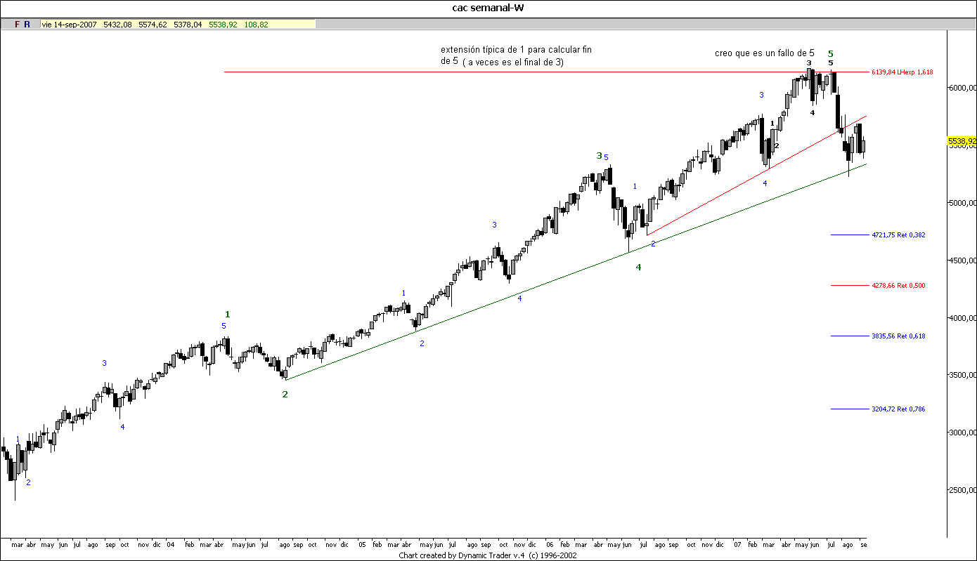 Pues dado cómo anda el oscilador de 8 en el diario, esta semana me he puesto bajista.Hurgando, hurgando, he llegado a la conclusión de que el panorama donde más claro se ve es en el cac. Al final irá como todo, vamos, pero prefiero meterme donde tenga más claras las referencias. Primero, un vistazo al semanal.