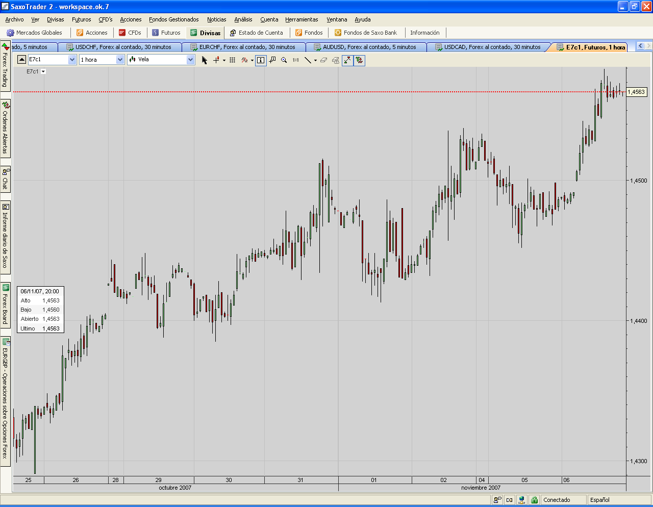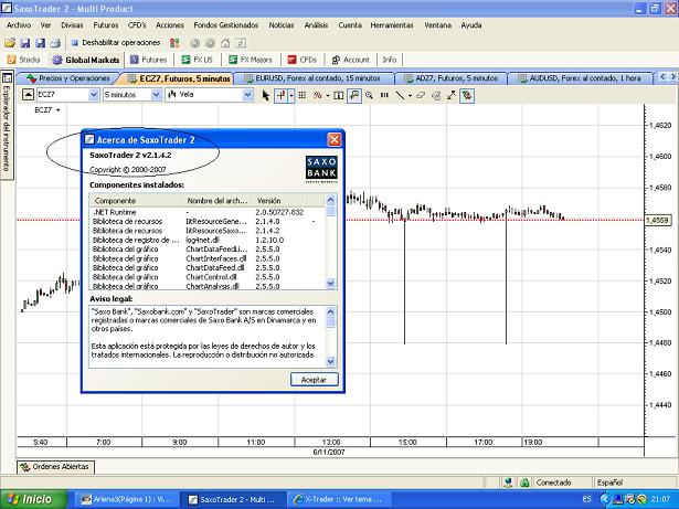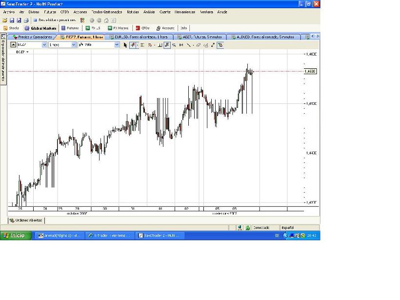 Esto es todos los dias por no hablar de las velas imaginarias que salen en el contado y desaparecen al rato, no hay ninguna ahora, de haberla la habria pegado aqui también. Y conste que reconozco que cuando el visual peta , el Saxo no lo hace o no con la misma frecuencia, y por eso mantengo el Saxo trader, para no quedarme colgada sin TR, pero de ahi a que sea más profesional que el visual, ni hablar. Ni en herramientas ni en facilidad de dibujar ni de manejar elementos y mucho menos en máximos y mínimos reflejados en los gráficos. Las velas cierran siempre con retraso en todos los minutajes y podría seguir...