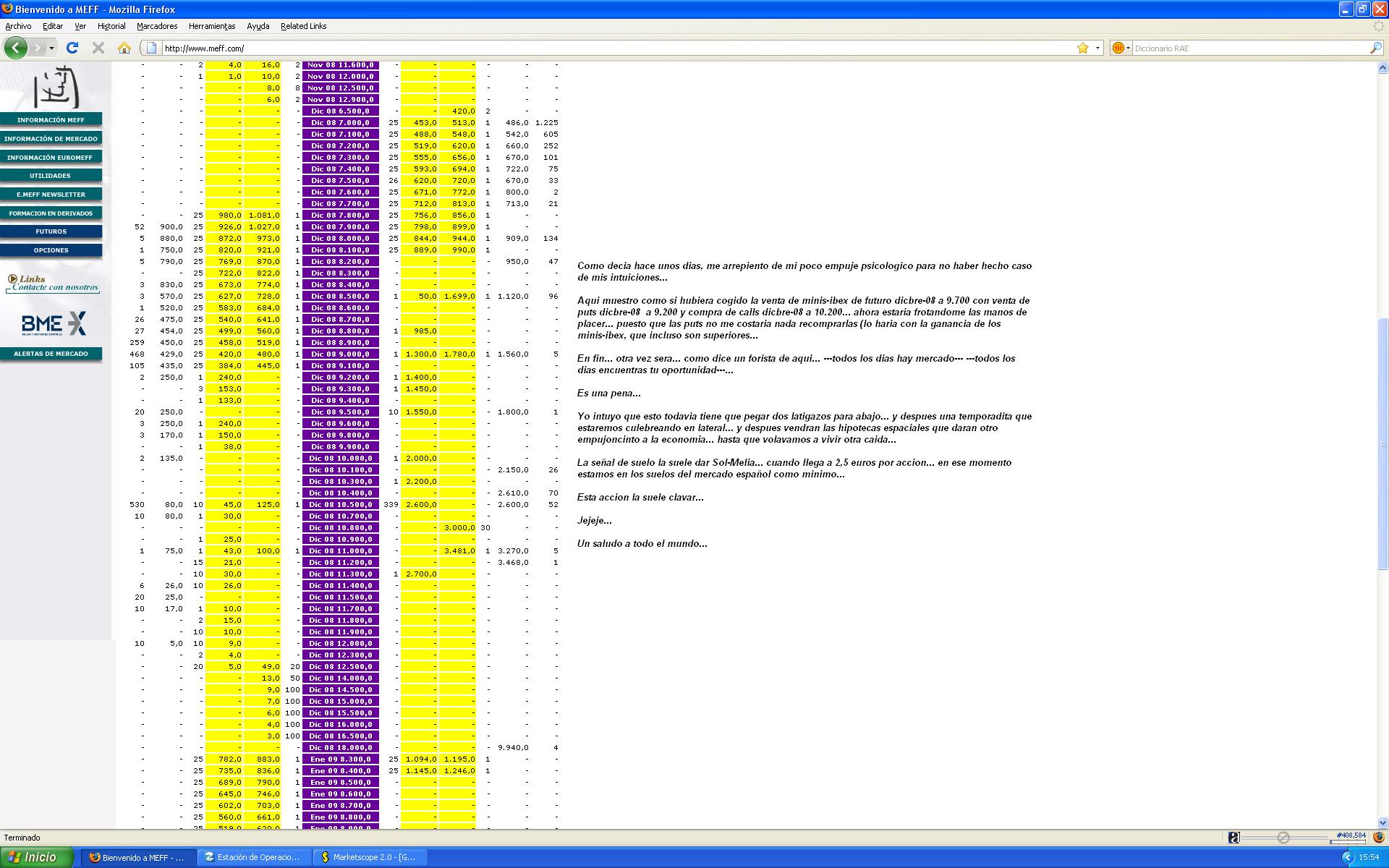 Un call no te cubre un futuro vendido. La delta de tu futuro vendido es siempre -100. La de una call ATM, por ejemplo, es aproximadamente +50. Si el precio sube, al inicio empiezas perdiendo como si tuvieras medio futuro vendido (delta -50). Progresivamente la delta de la call iría aumentando y protegiéndote más, pero no te protegería del todo hasta que el precio estuviera muy arriba. Como puedes ver, tienen comportamientos distintos un futuro y una opción.cls escribió: Mi pregunta es: si entro corto en un futuro (sin stop-loss) y compro un call, de alguna forma me estoy cubriendo con las velas salta-stop, no?. Si resulta que hay un barrido no me sacarán del futuro (no tengo stop-loss) y si luego el precio baja, sólo habré perdido la prima de la opción a cambio de protegerme de esos barridos. Es como si hubiera pagado un stop por adelantado pero sabiendo que no me sacará de la posición si es falso.