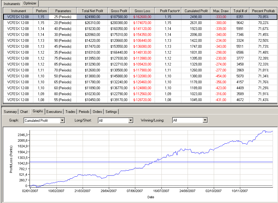 Resultados en el 2007 para distintos períodos sobre el stoxx en 1min (sin comisiones ni deslizamiento):