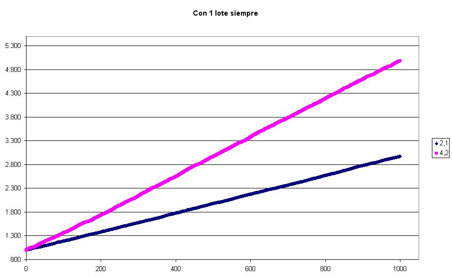 Eso en general. Para este caso concreto, se me ocurre una simulación variante del MM tipo regla del 2% que hemos hecho, consistente en empezar ambos sistemas con un lote e ir incrementando con la misma regla pero condicionada a que el sistema haya generado los fondos suficientes para el volumen que la regla le marca, más los fondos necesarios para unas supuestas garantías (éstas pueden hacerse = 0 para simular Mercados sin garantías).