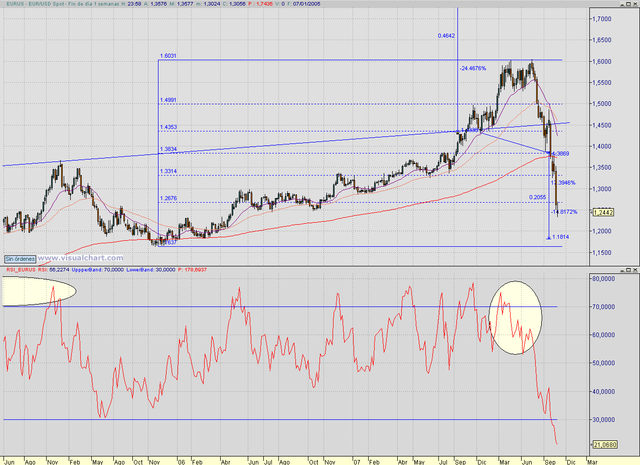 Pos yo lo veo clarito, clarito. Esto no para de bajar hasta 1,18, te acuerdas spirit del macro hch del que hablamos en su día? y si me apuras tengo un fivo por ahí que me lo manda a 1,04. Después ya veremos pero seguramente habrá corrección gorrrrda o quien sabe, ¿un cambio de tendencia quizás?. Ea, corrrrtos un poquito más :-D. De momenti paradita en 1,2250 pa formar la siguiente figura bajista que no sé por qué me da que será un triangolo, juas, juas, juas. Si es que esto está mamao de figura en figura y tiro porque me toca. El objvo bajista viene dado por cada figura y el objvo correctivo susiguiente se calcula de forma bastante aproximada con un fivo (1,6 o 2,6) desde el suelillo (que siempre está cerca del último objvo bajista). Lástima que me falte el autocontrol y encima no tenga un duro que si no... en fin una pena desperdiciar un momento así porque estoy seguro de que vamos a tardar en ver, si es que lo volvemos a ver algún dia, un mercado tan alucinante como este y... joooder!!! ya podíamos habernos retirado en estos meses. En fin, por lo menos vamos aprendiendo de que va esto y el autocontrol ya llegará, nadie puede equivocarse en lo mismo eternamente.