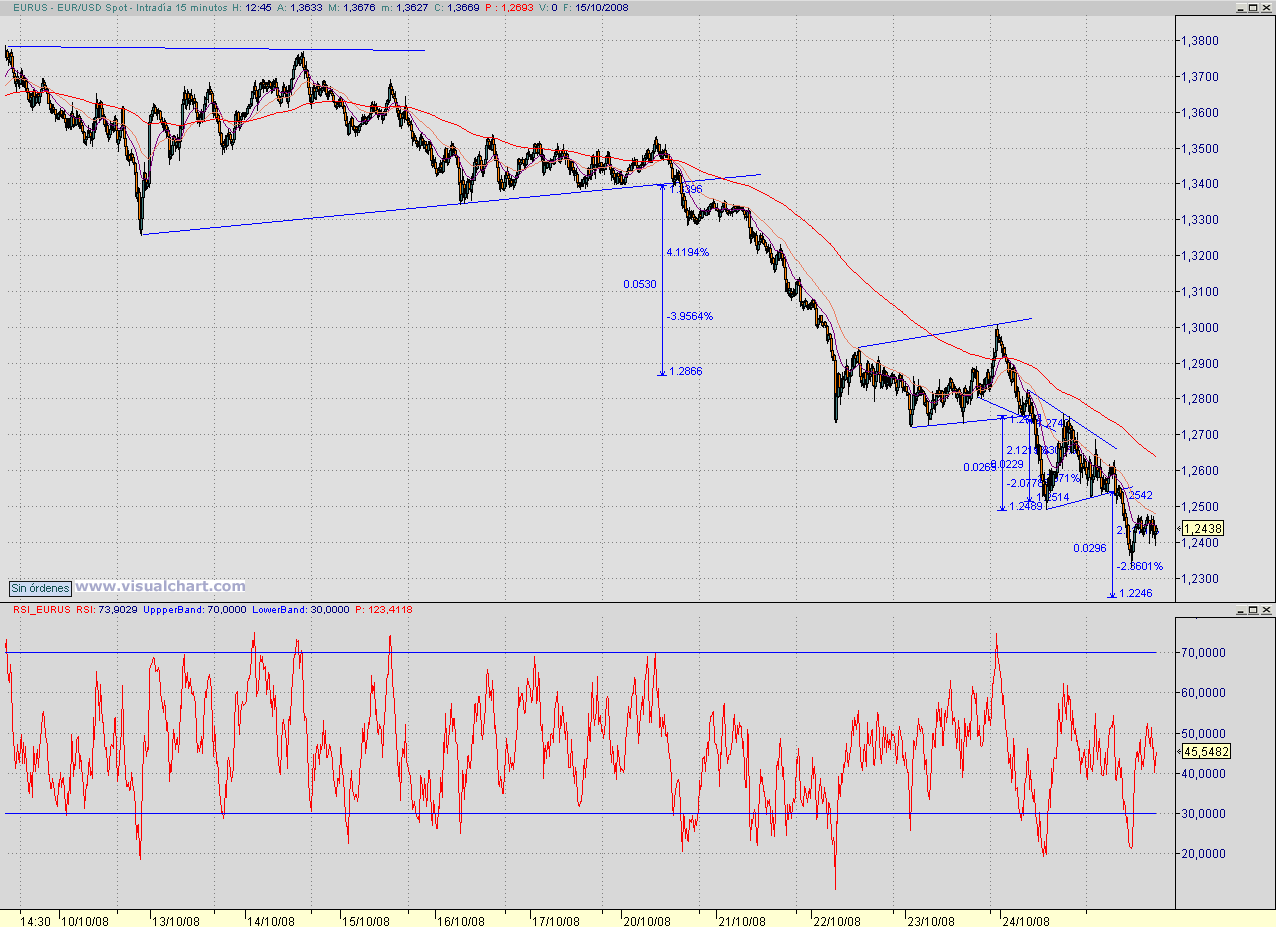 Me fijo casi en exclusiva en el DJIA, en sus resistencias, soportes y roturas de minilineas de tendencia y de momento son más fiables que las del euro. El euro no hace más que seguirlo pero con distinta intensidad dependiendo el par que trabajes.
