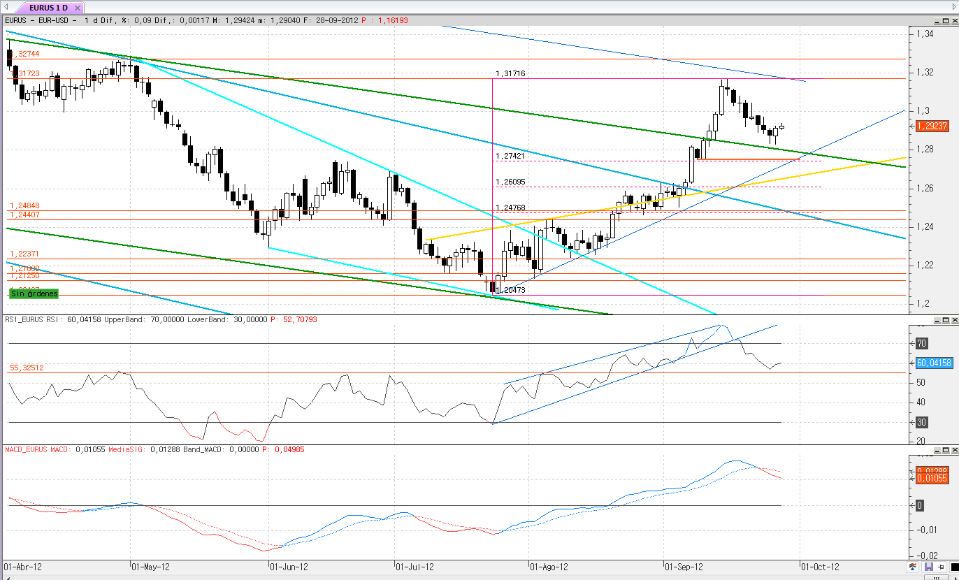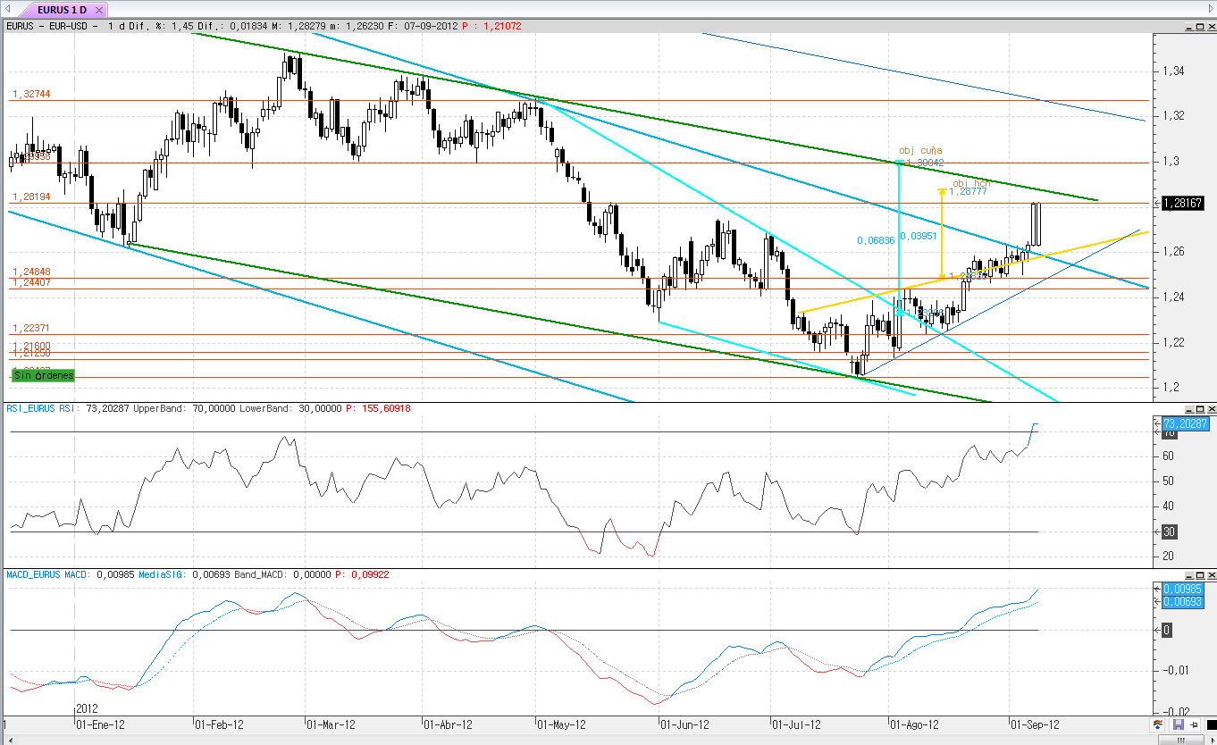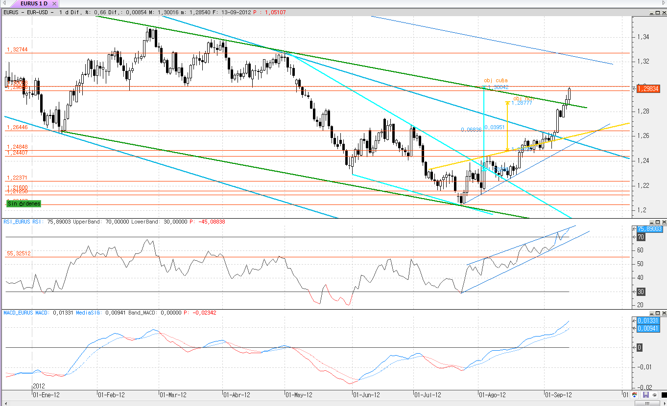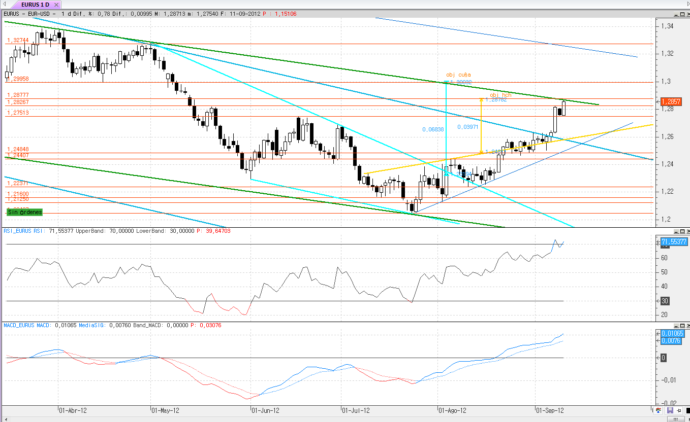 Después de la rotura de la cuña, estuvo unos días confirmando, y desarrollando posteriormente el hombro derecho, finalmente rompiendo al alza y confirmándolo el viernes tras unos días de consolidación. El objetivo de la figura h-c-h está en 1.2877 y la de la cuña en 1.3042. El viernes se paró en 1.2819, tras romper la que tenía anteriormente en 1.2753. ¿Y ahora qué? Pienso que podría subir un poco más, hasta la zona 1.2850-1.2870, donde daría por concluída la figura h-c-h, en este punto coincide el objetivo de la figura y el techo del canal bajista con una pendiente menos inclinada. Si no supera estos niveles el retroceso sería a zonas de soporte. En mi opinión sería abrir cortos en la zona 1.2850-1.2875 con stop en 1.2890. La superación del techo canal le llevaría al objetivo de la cuña 1.3004.