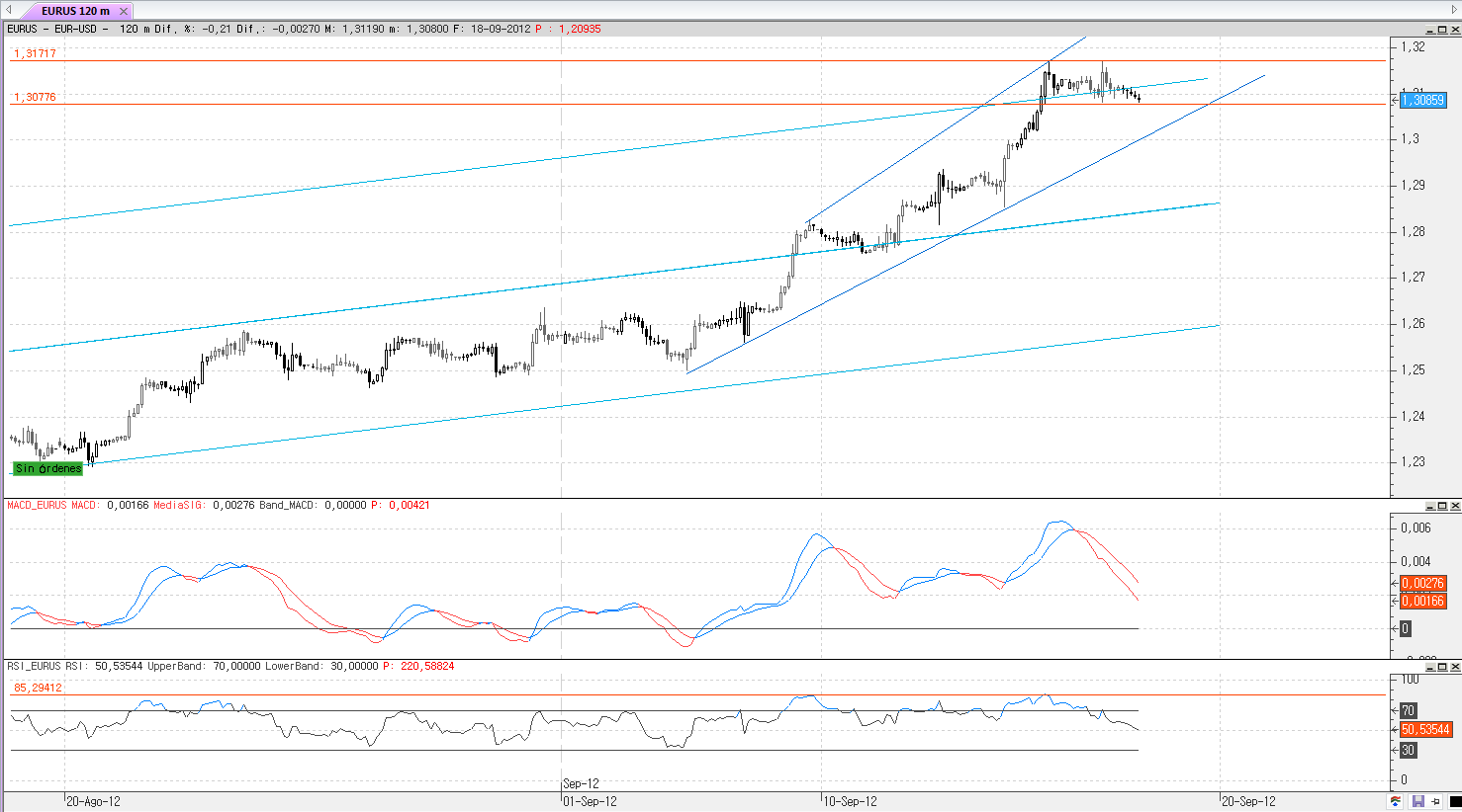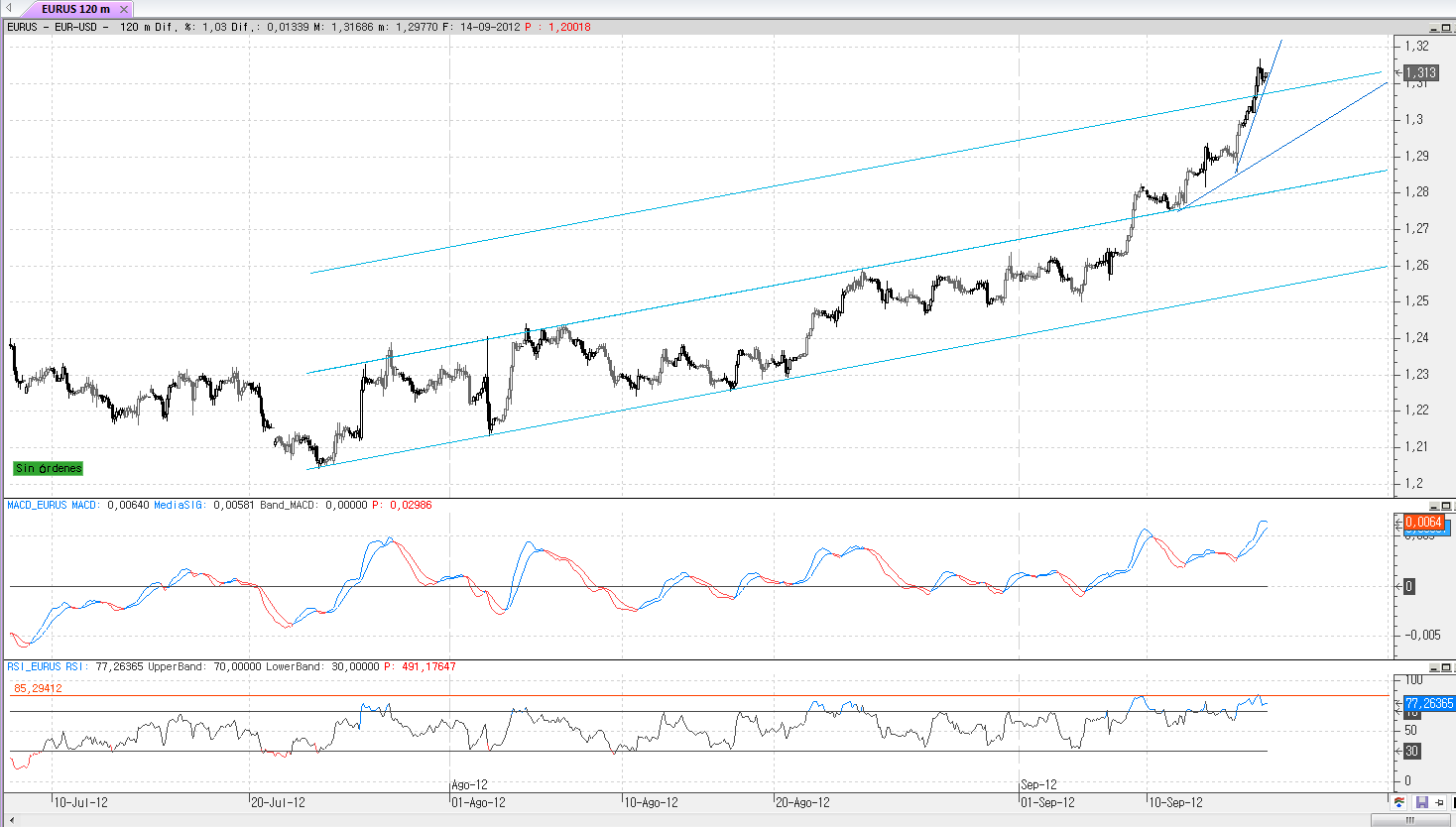 Buenos días, en la estrategia que nos marcamos estos días perdemos en corto y ganamos en largo un poco de suerte por nuestra parte al romper al alza tan limpiamente y sin barriditas. El viernes hizo un máximo en 1.3168 el objetivo que nos marcamos era el 1.3250 que bajamos al lunes en 1.3238 que es donde está situada la ltb, particularmente en 1.3230 se liquida, el stop de protección se podría ejecutar en el mínimo de la vela negra que realizó a las 20.00 en gráfico de 120m más algún pips, 1.3085. Y seguimos con la estrategia de estos días, corto en la zona 1.3230-1.3238 stop en 1.3280, en 1.3274 se encuentra una leve resistencia, y si la supera el siguiente objetivo en 1.3505. Mi opinión, que es sólo una opinión porque como veis el mercado es soberano, que en la zona 1.3230-1.3274 esta subida debería parar y corregir como mínimo a la zona 1.30, y dependiendo de ésta corrección, veremos la siguiente subida.