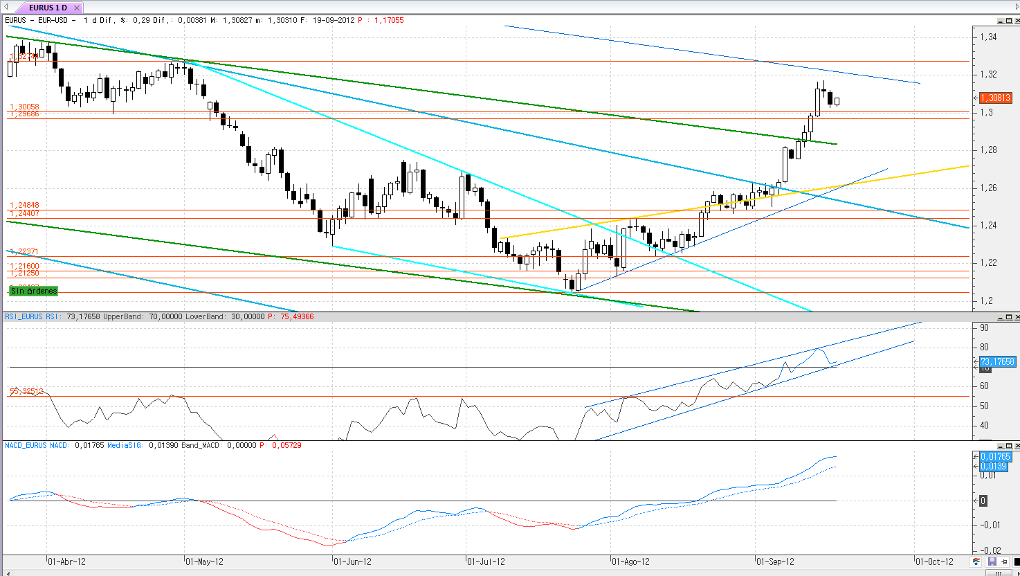 Buenos días, nos saco el stop, no llegó a objetivo, se ve cierta debilidad con divergencias claras. He tomado posiciones cortas en 13090 esperando que pierda el soporte de 1.3077 con objetivo 1.3015 en primer lugar y en segundo 1.2934, el stop esta vez esta un poco alejado en 1.3180.