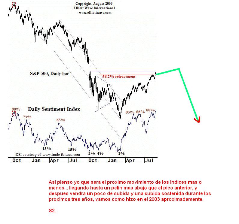 Pues pa mí que Pretcher comete un error de bulto en sus previsiones: si os fijáis, durante la caída en NINGÚN momento el índice de sentimiento llega a marcar un 80% de sentimiento alcista...esto al final va como los osciladores: una cosa es la sobrecompra y otra la megasobrecompra. Quiero decir que la megasobrecompra en un rebote es rara. Normalmente un estocástico en una tendencia bajista, cuando alcanza la zona de sobrecompra es señal de venta. Vemos que el indicador de marras alcanzó un 85 y después un 86 y lo único que hizo fue ladear un poco y tirar parriba...si fuera una onda cuarta que dice Prechter difícilmente pasaría eso. Se supone que una onda cuarta es un consumir tiempo, pero sin demasiada fuerza, lo típico es un movimiento lateral, un triángulo. El 38% de retroceso ha sido alcanzado y esto no ha hecho más que parar un rato a echar una meaílla...La lectura que hace, en el ibex por ejemplo, no encaja. Pa entendernos más fácil:Prechter dice que este rebote es una subonda dentro de la onda de caída. Yo digo que si lleva tanta fuerza es porque es de un grado superior al que él dice, o sea, no es una subonda, sino una onda del mismo grado que TODA la caída, con que si el 38% es el final, necesariamente debería ladear un webo antes de reanudar la marcha bajista...