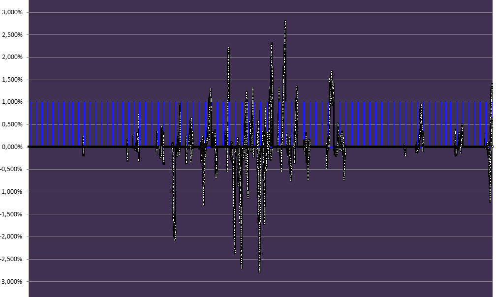 Pongo un gráfico porcentual del movimiento intradía del índice, porque así se ve bien que recorrido tiene el precio en intradía. Las barras azules son los días, y el movimiento las líneas negras con cuadritos blancos.
