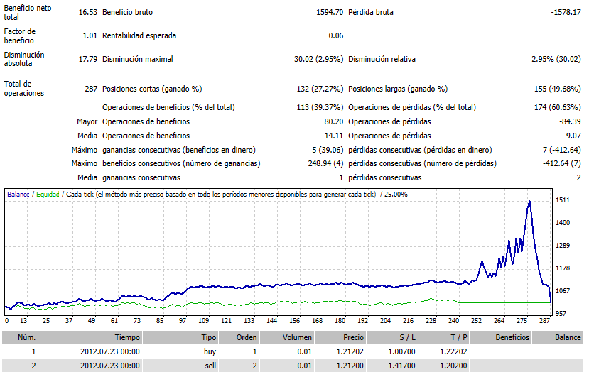 El período es desde 2012.07.23 hasta 2013.12.31. Capital inicial de 1K y órdenes de 0.01 lotes. Para comparar basta con multiplicar todo por 10.