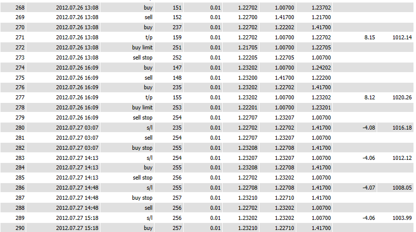 Bueno, ahí va una Excel con todos los niveles operados desde el 24 de julio de 2012 en que el EURUSD está en 1.2050 hasta el momento en que el precio llega a 1.33, el 19 de diciembre de 2012. Podéis comprobar vosotros mismos, pero si hay algún fallo en la operativa, debería ser menor y no afectar al rendimiento.