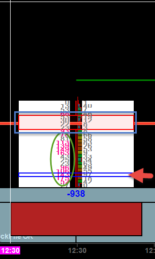 En la captura de las 12.30, tenemos una vela, que su cuerpo y sobretodo close de la misma ( rectángulo azul ), se ha quedado por encima de todo la masa de ventas ( elipse verde). Y además el "diagonal B/A " marca un extasis de volumen