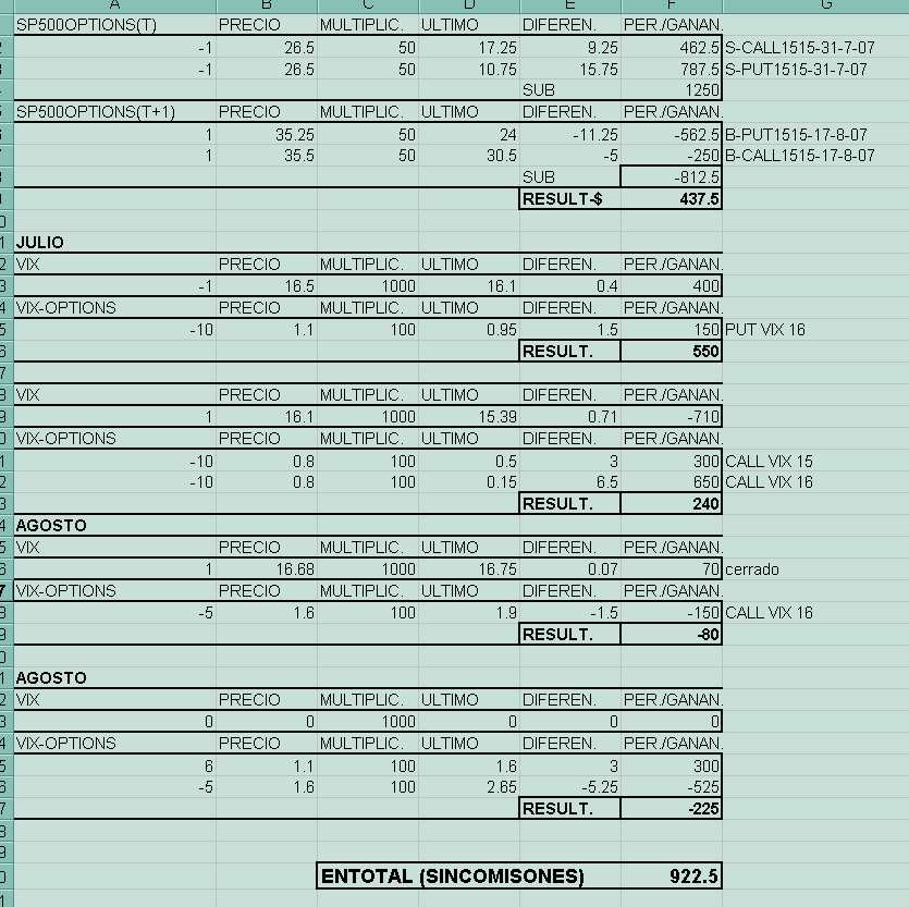 En Fin el punto de maxima ganancia y como dije de salida para no tener mas riesgos, lo toco el dia de Santiago, por la tarde, como no estaba delante de pantalla supongo los datos de cierre, con los que nos queda un beneficio de 990$ sobre unas garantias supuesta y tirando "parriba" de 2000$, en el caso de la estrategia total. Si hubieramos abierto a el calendar y el put-ratio del vix y nos hubieramos olvidado, la cosa hubiera quedato en unas ganancias de 300$ sobre una garantias de menos de 1000$, lo cual tan poco parece que este mal, los por cientos (%) lo dejos para el que los quiera poner, no se cuanto llevamos deestrategia ya parece como de casa......?:lol: