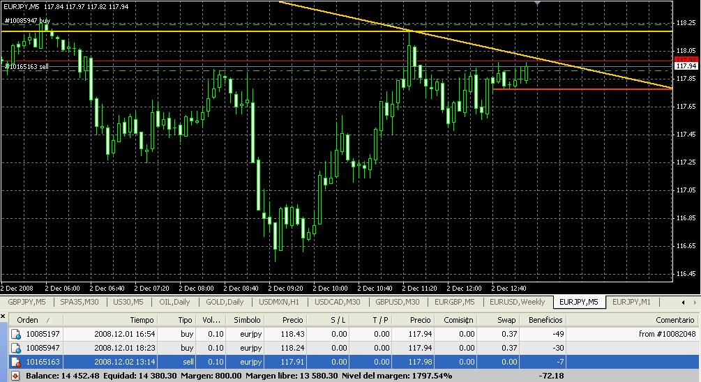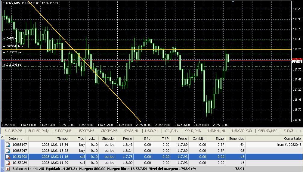 Por lo tanto cierro todas las posiciones sell y me quedo con o,2 lotes buy abiertos. Si me he equivocado y comienza a caer con fuerza voy a martingalear para recuperar lo perdido con este movimiento. Abriría 0,4 lotes sell en algún punto entre 117,40 y 117,25. La situación quedaría entonces +0,2 lotes buy -0,4 lotes sell. Todavía dentro de los límites del hedge que están mucho más lejos (+2,5 lotes buy, -2,5 lotes sell)