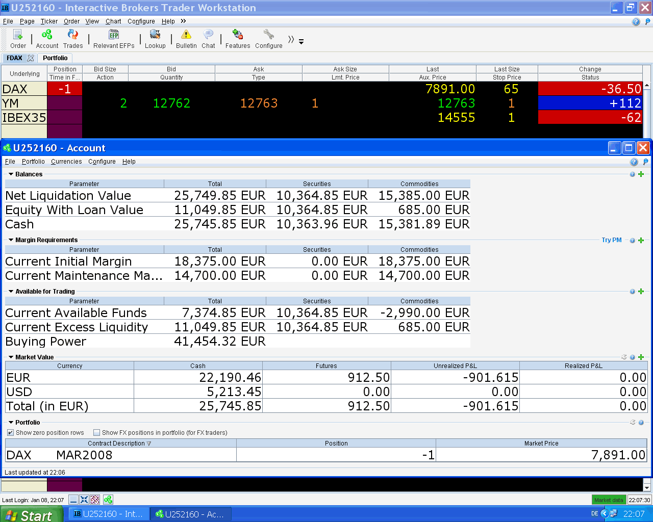 hoy retiré 2.500 EUR de la cuenta, creo que ya no me van a hacer falta. De los 9.000 EUR que ingresé el año pasado para que no me echasen del mercado aún quedan 4.500 EUR que espero retirar algún día. Tengo que ir juntando capital para comprar acciones cuando las considere baratas, desde que me lié con esta mierda de los futuros he dejado de comprarlas y para ganar dinero es la mejor inversión que hay.