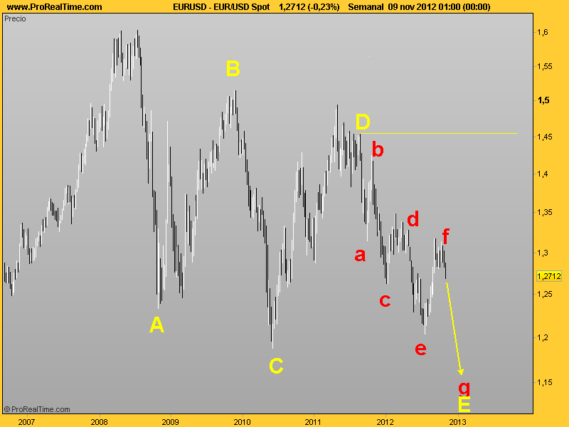 Resumiendo, mi opinión es que tras esta caida (que durará todavía mas de un mes) hasta 1,247-1,217, puede volver a subir con fuerza para hacer una vela mensual con cierre por encima de la de octubre (1,2957), ¡¡Ojalá!!, si bien, dudo mucho que supere el máximo de 1,317 porque el 1,328 es un stop que no veremos violado hasta después de tocar suelo allí por el 0,96 más o menos. ;)