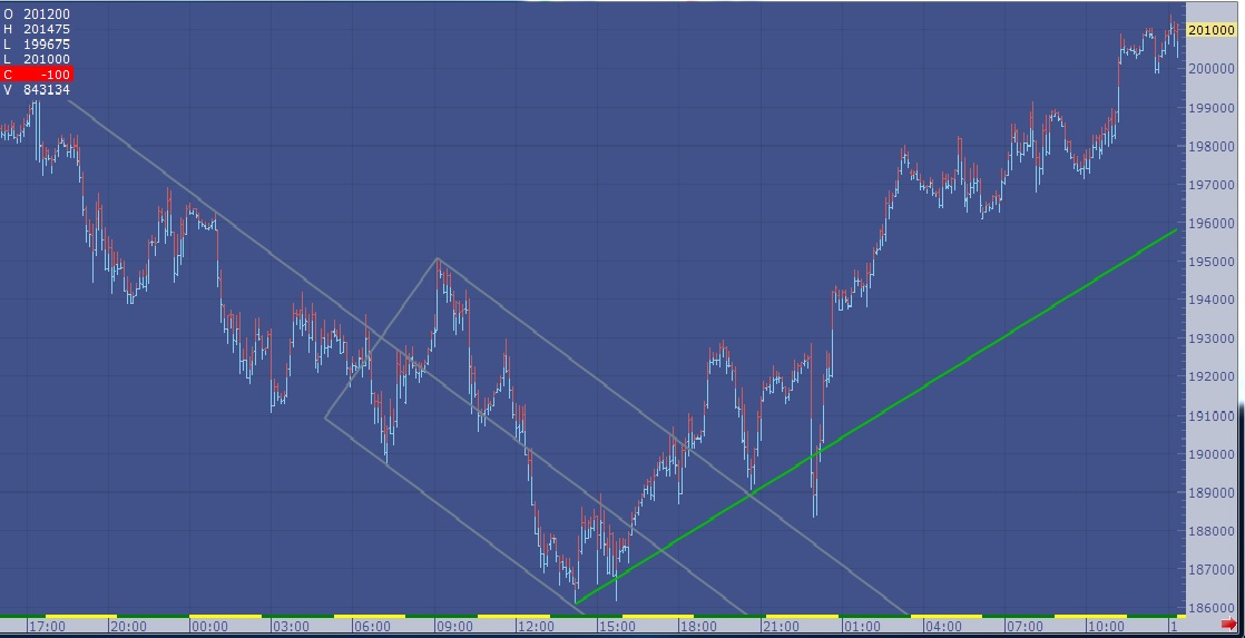 Yo creo que hay un principio digamos "natural" (fijémonos p. ej, en la bajada de finales de Agosto) en el que el primer punto de referencia lo marca un consenso de mercado muy natural en el sentido de que en algún sitio tiene que parar, a la vez que tiene cierto sentido por varios factores; proporción del movimiento en unos participantes, cálculos fundamentales en otros, etc. Se produce esa primera referencia. La siguiente ya parte de esa base (ya se creyó referencia adecuada), y la siguiente con más consenso porque tiene dos precedentes, y así se crea una base de puntos que puedas unir con una línea.