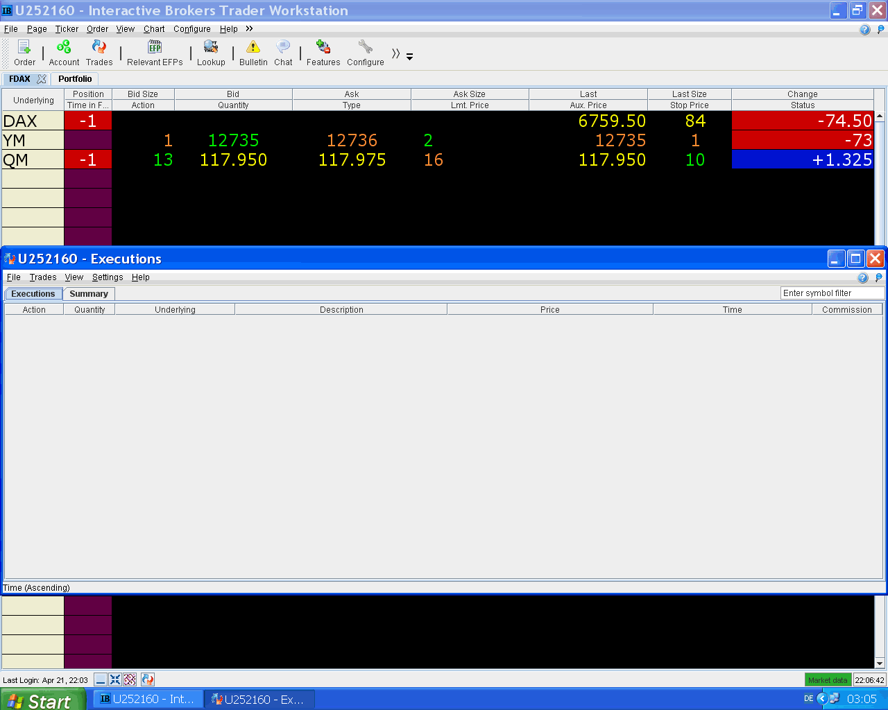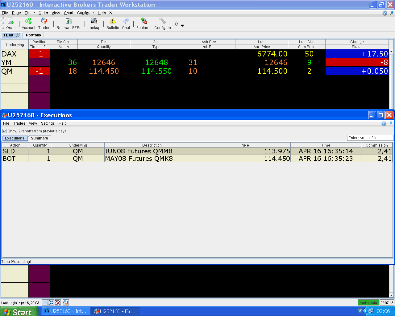 hoy subió todo. En el futuro del petróleo ya cambié el vencimiento de mayo por el de junio empeorando la entrada en 0,5 $, no se por que no se ven las ejecuciones, antes se podían ver todo el día en la TWS.