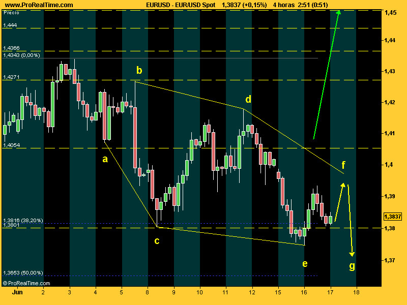 Pos yo creo que he dao con la pauta que está desarrollando el bicho: una diamétrica. Pa entendernos, le falta una patita parriba y otra pabajo, u sea, ke si estoy en lo correcto, mañana hace como que sube, pero sube poco y luego se gira y baja unos bastantes pipos. Si os fijáis en la pauta, empieza con una triangulación expansiva y luego se invierte para contraerse. Estamos en la onda f que debe ser más corta que la e por tanto. Luego la g hacia abajo será más larga, como que llega al 1.36 vaya...