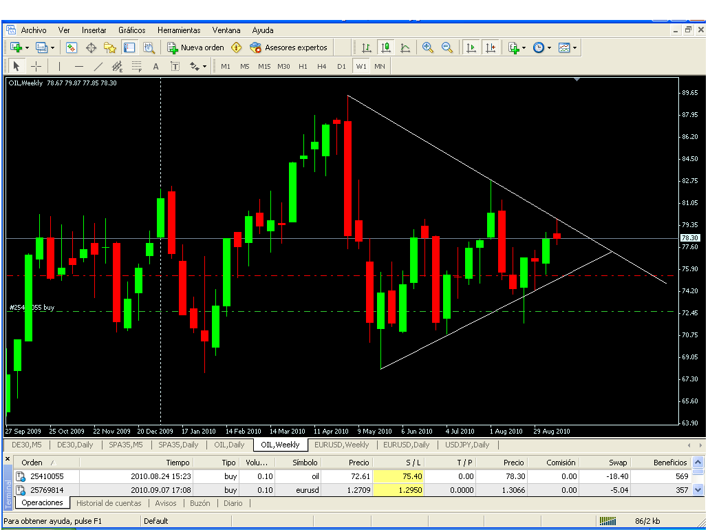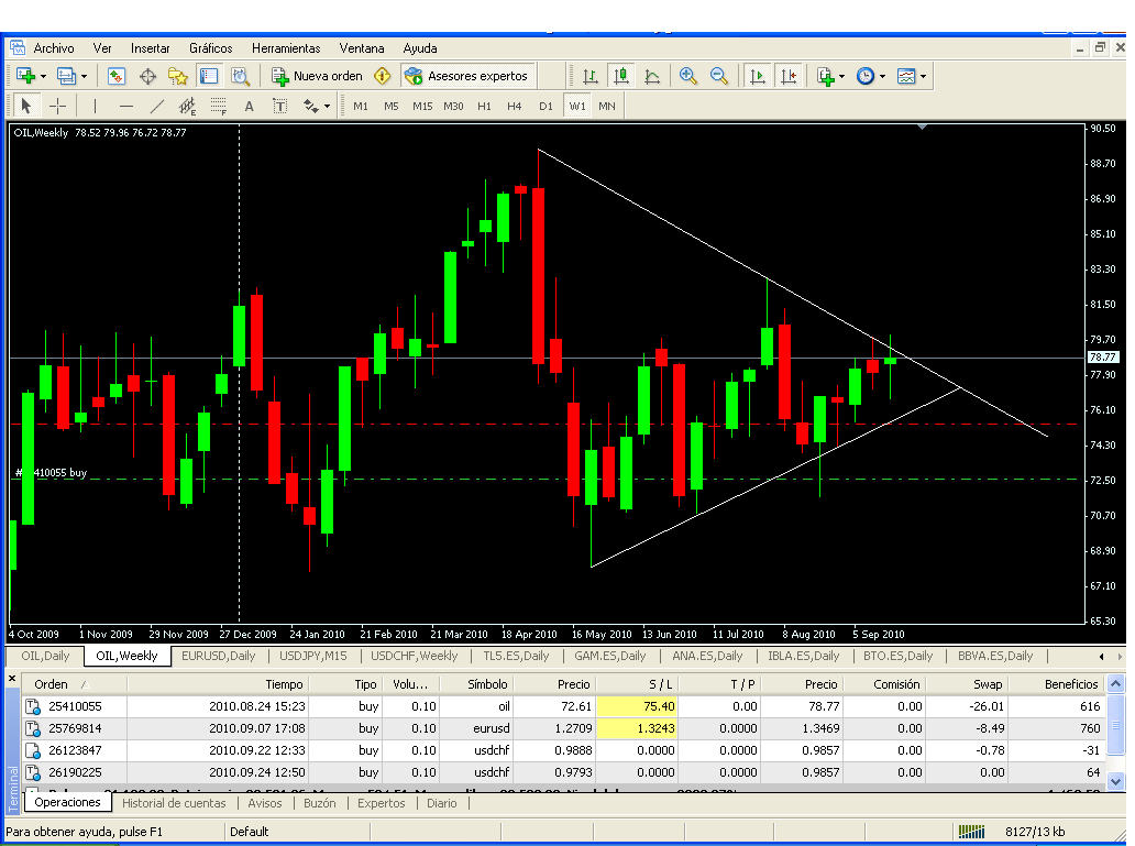 Pues después de cerrar un par de opes para aprobechar un poquito el ruido y financiar los retrocesos temporales de oil y eurus en el balance...el oil busca con fuerza la base técnica de la linea alcista de tendencia.