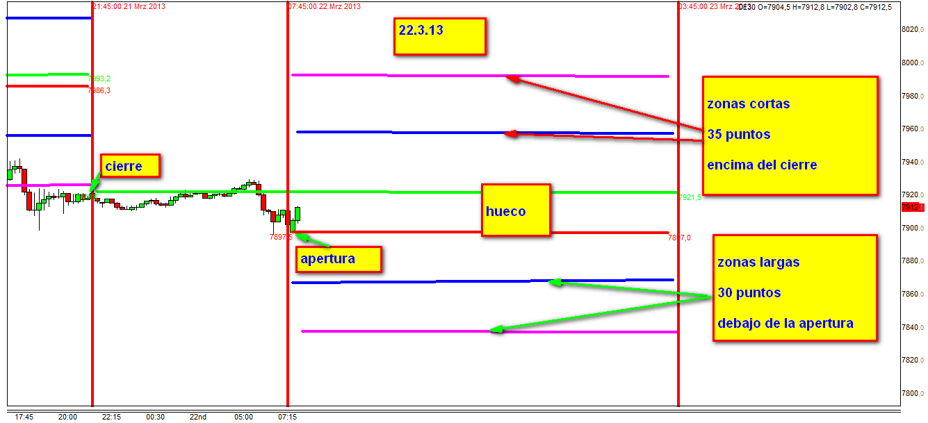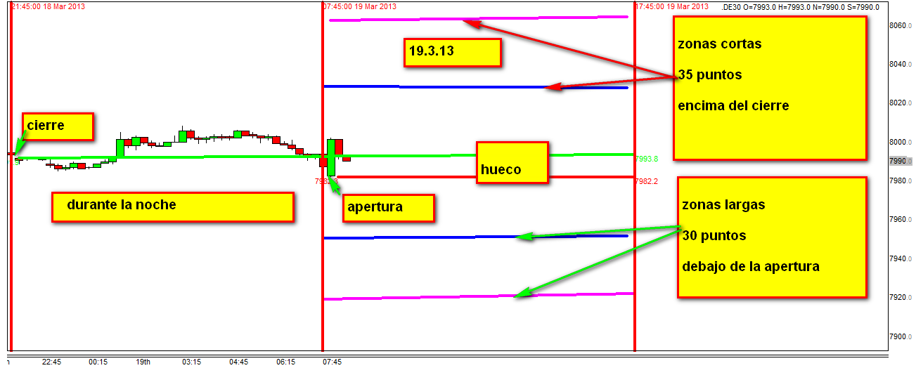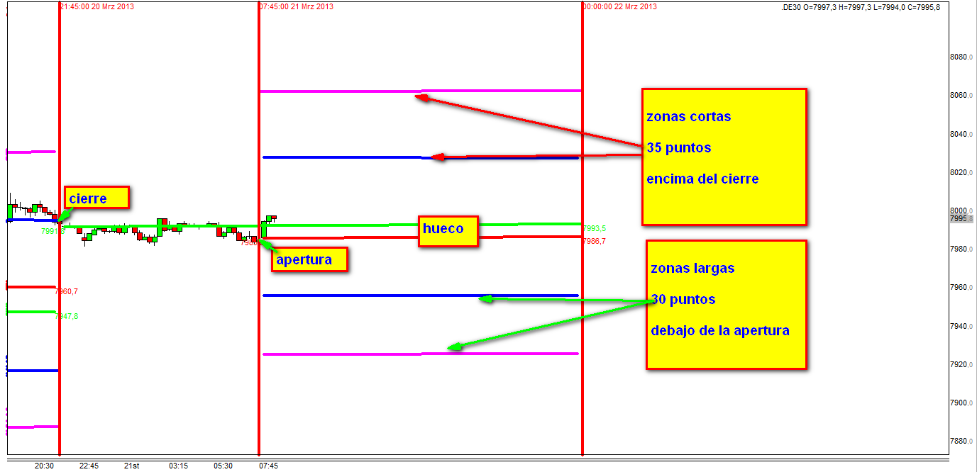 Opero Futuros, no CFDs, hoy veo que la apertura en futuros del FDAX es 8001, y en tu gráfico lo marcas antes de las 8:00 , hora España...en 798X..... por tanto los valores de andamio entrada largos 30 puntos y 60 por debajo apertura varían...