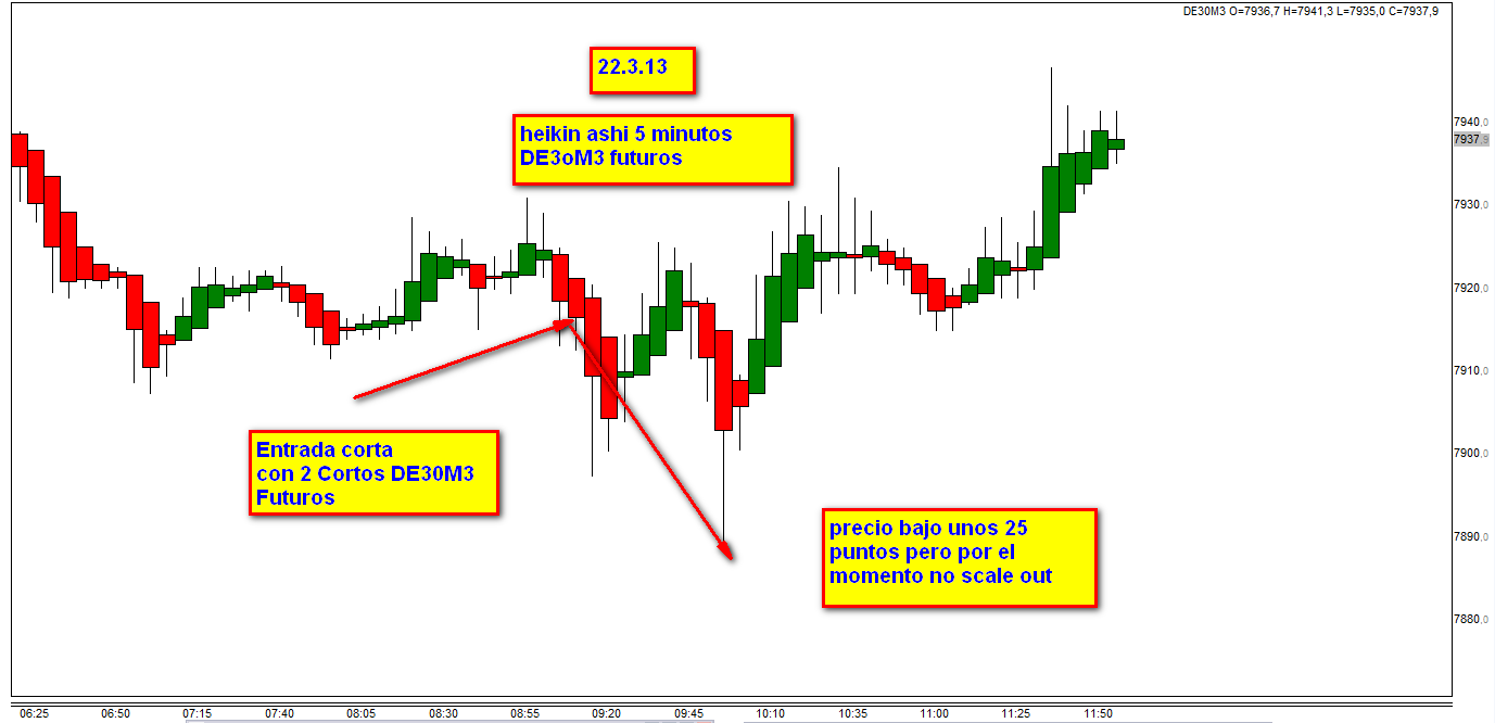 Adjunto grafico del DE30M3 heikin ashi de 5 minutos con la entrada corta correcta que ha sido en mi caso al precio de 7914 y el precio del DE30 en el momento que ha sido 7901.
