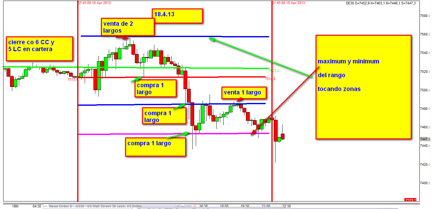 Hoy vamos a anadir la operativa de cortos/largos en la zona enlargada de la apertura y cierre . La zona enlargada se extiente aproximadamente hacia la mitad de la zona larga para largos y hacia la mitad de la zona corta para cortos. Las entradas aplicamos con la ayuda del Heikin Ashi de 5 minutos a partir de las 9h tal como explicado con varios graficos los ultimos dias. Al abrir posiciones el precio lo consideramos como entrada en la primera zona y si el precio va en contra la segunda zona tendra la misma distancia como la zonas normales en su dia.