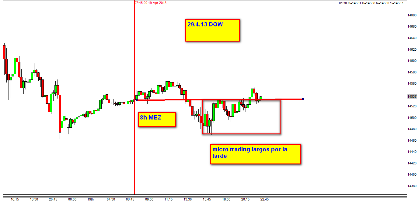 Visto los dos otros indices estaba bastante seguro que al cierre el DOW terminaba con unos beneficios y cada vez que el DOW bajaba entraba largo. Muchas veces con diferentes precios segun el precio bajaba. Hize un micro trading con largos.