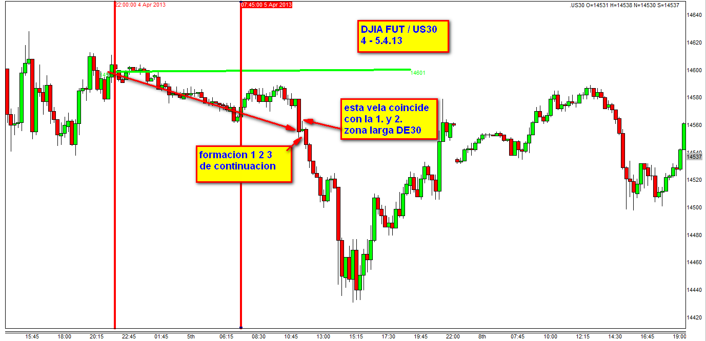 - De golpe la vela cruzaba la 1. y 2. zona larga y conforme a las reglas y de acuerdo con los DJIA FUt/US30 ninguna entrada larga.